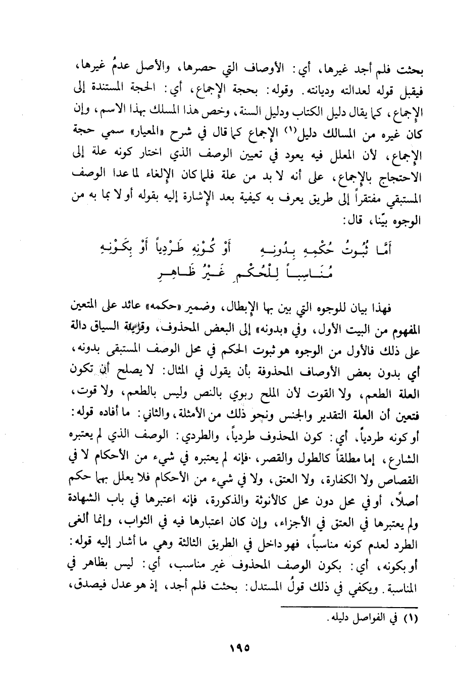 بحثت فَلم أجد غَيرهَا أَي الْأَوْصَاف الَّتِي حصرها وَالْأَصْل عدم غَيرهَا فَيقبل قَوْله لعدالته وديانته وَقَوله بِحجَّة الْإِجْمَاع أَي الْحجَّة المستندة إِلَى الْإِجْمَاع كَمَا يُقَال دَلِيل الْكتاب وَدَلِيل السّنة وَخص هَذَا المسلك بِهَذَا الِاسْم وَإِن كَانَ غَيره من المسالك دَلِيل الْإِجْمَاع كَمَا قَالَ فِي شرح المعيار سمي حجَّة الْإِجْمَاع لِأَن الْمُعَلل فِيهِ يعود فِي تعْيين الْوَصْف الَّذِي اخْتَار كَونه عِلّة إِلَى الِاحْتِجَاج بِالْإِجْمَاع على أَنه لَا بُد من عِلّة فَلَمَّا كَانَ الإلغاء لما عدا الْوَصْف المستبقي مفتقرا إِلَى طَرِيق يعرف بِهِ كَيْفيَّة بعد الْإِشَارَة إِلَيْهِ بقوله أَو لَا بِمَا بِهِ من الْوُجُوه بَينا قَالَ