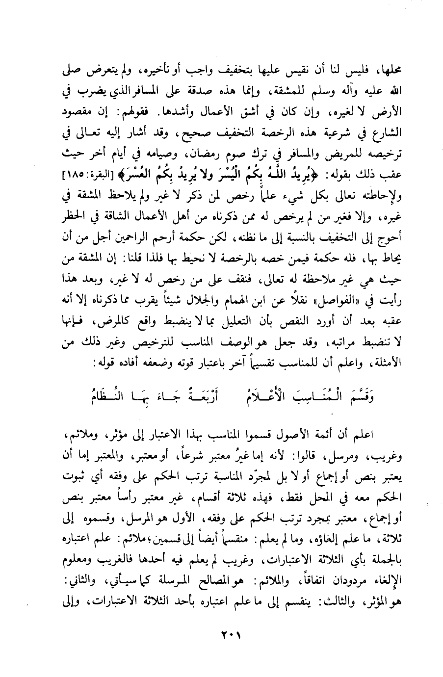 محلهَا فَلَيْسَ لنا أَن نقيس عَلَيْهَا بتَخْفِيف وَاجِب أَو تَأْخِيره وَلم يتَعَرَّض صلى الله عَلَيْهِ وَسلم للْمَشَقَّة وَإِنَّمَا هَذِه صَدَقَة على الْمُسَافِر الَّذِي يضْرب فِي الأَرْض لَا لغيره وَإِن كَانَ فِي أشق الْأَعْمَال وأشدها فَقَوْلهم إِن مَقْصُود الشَّارِع فِي شَرْعِيَّة هَذِه الرُّخْصَة التَّخْفِيف صَحِيح وَقد أَشَارَ إِلَيْهِ تَعَالَى فِي ترخيصه للْمَرِيض وَالْمُسَافر فِي ترك صَوْم رَمَضَان وصيامه فِي أَيَّام أخر حَيْثُ عقب ذَلِك بقوله {يُرِيد الله بكم الْيُسْر وَلَا يُرِيد بكم الْعسر} ولإحاطته تَعَالَى بِكُل شَيْء علما رخص لمن ذكر لَا غير وَلم يُلَاحظ الْمَشَقَّة فِي غَيره وَإِلَّا فَغير من لم يرخص لَهُ مِمَّن ذَكرْنَاهُ من أهل الْأَعْمَال الشاقة فِي الْحَظْر أحْوج إِلَى التَّخْفِيف بِالنِّسْبَةِ إِلَى مَا نظنه لَكِن حِكْمَة أرْحم الرَّاحِمِينَ أجل من أَن يحاط بهَا فَلهُ حِكْمَة فِيمَن خصّه بِالرُّخْصَةِ لَا نحيط بهَا فَلِذَا قُلْنَا إِن الْمَشَقَّة من حَيْثُ هِيَ غير مُلَاحظَة لَهُ تَعَالَى فنقف على من رخص لَهُ لَا غير وَبعد هَذَا رَأَيْت فِي الفواصل نقلا عَن ابْن الْهمام والجلال شَيْئا يقرب مِمَّا ذَكرْنَاهُ إِلَّا أَنه عقبه بعد أَن أورد النَّقْص بِأَن التَّعْلِيل بِمَا لَا يَنْضَبِط وَاقع كالمرض فَإِنَّهَا لَا تنضبط مراتبه وَقد جعل هُوَ الْوَصْف الْمُنَاسب للترخيص وَغير ذَلِك من الْأَمْثِلَة وَاعْلَم أَن للمناسب تقسيما آخر بِاعْتِبَار قوته وَضَعفه أَفَادَهُ قَوْله ... وَقسم الْمُنَاسب الْأَعْلَام ... أَرْبَعَة جَاءَ بهَا النظام ...