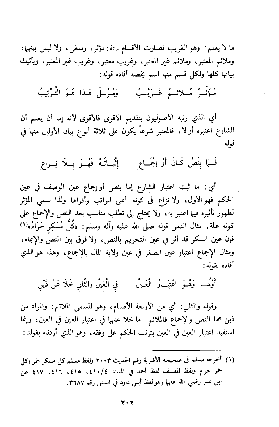 أَي مَا ثَبت اعْتِبَار الشَّاعِر إِمَّا بِنَصّ أَو إِجْمَاع عين الْوَصْف فِي عين الحكم فَهُوَ الأول وَلَا نزاع فِي كَونه أَعلَى الْمَرَاتِب وأقواها وَلذَا سمي الْمُؤثر لظُهُور تَأْثِيره فِيمَا اعْتبر بِهِ وَلَا يحْتَاج إِلَى تطلب مُنَاسِب بعد النَّص وَالْإِجْمَاع على كَونه عِلّة مِثَال النَّص قَوْله صلى الله عَلَيْهِ وَسلم كل مُسكر حرَام فَإِن عين السكر قد أثر فِي عين التَّحْرِيم بِالنَّصِّ وَلَا فرق بَين النَّص والإيماء وَمِثَال الْإِجْمَاع اعْتِبَار عين الصغر فِي عين ولَايَة المَال بِالْإِجْمَاع وَهَذَا هُوَ الَّذِي أَفَادَهُ بقوله ... أَولهَا وَهُوَ اعْتِبَار الْعين ... فِي الْعين وَالثَّانِي خلا عَن ذين ...