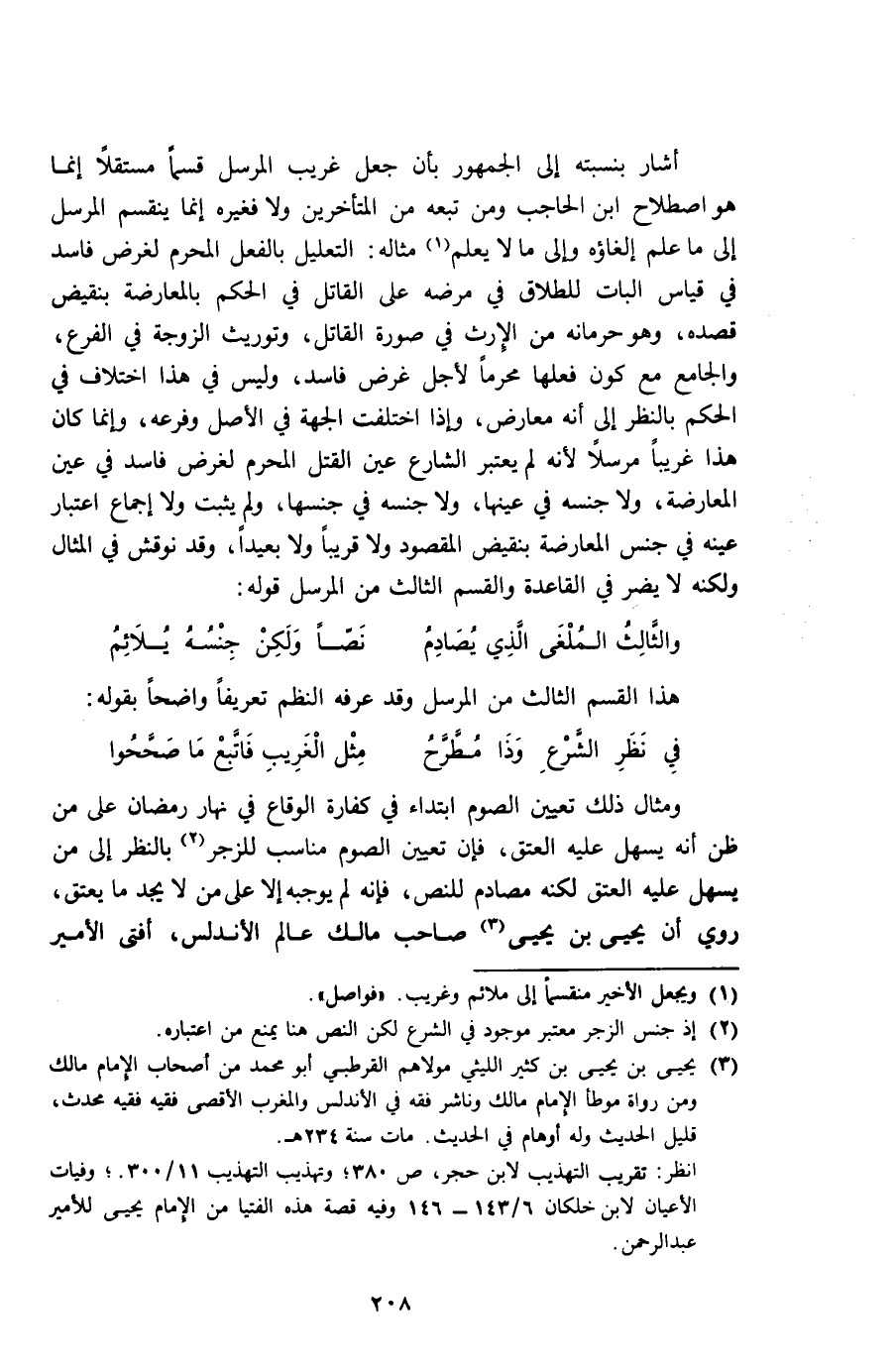 وَمِثَال ذَلِك تعْيين الصَّوْم ابْتِدَاء فِي كَفَّارَة الوقاع فِي نَهَار رَمَضَان على من ظن أَنه يسهل عَلَيْهِ الْعتْق فَإِن تعْيين الصَّوْم مُنَاسِب للزجر بِالنّظرِ إِلَى من يسهل عَلَيْهِ الْعتْق لكنه مصادم للنَّص فَإِنَّهُ لم يُوجِبهُ إِلَّا على من لَا يجد مايعتق رُوِيَ أَن يحيى بن يحيى صَاحب مَالك عَالم الأندلس أفتى الْأَمِير
