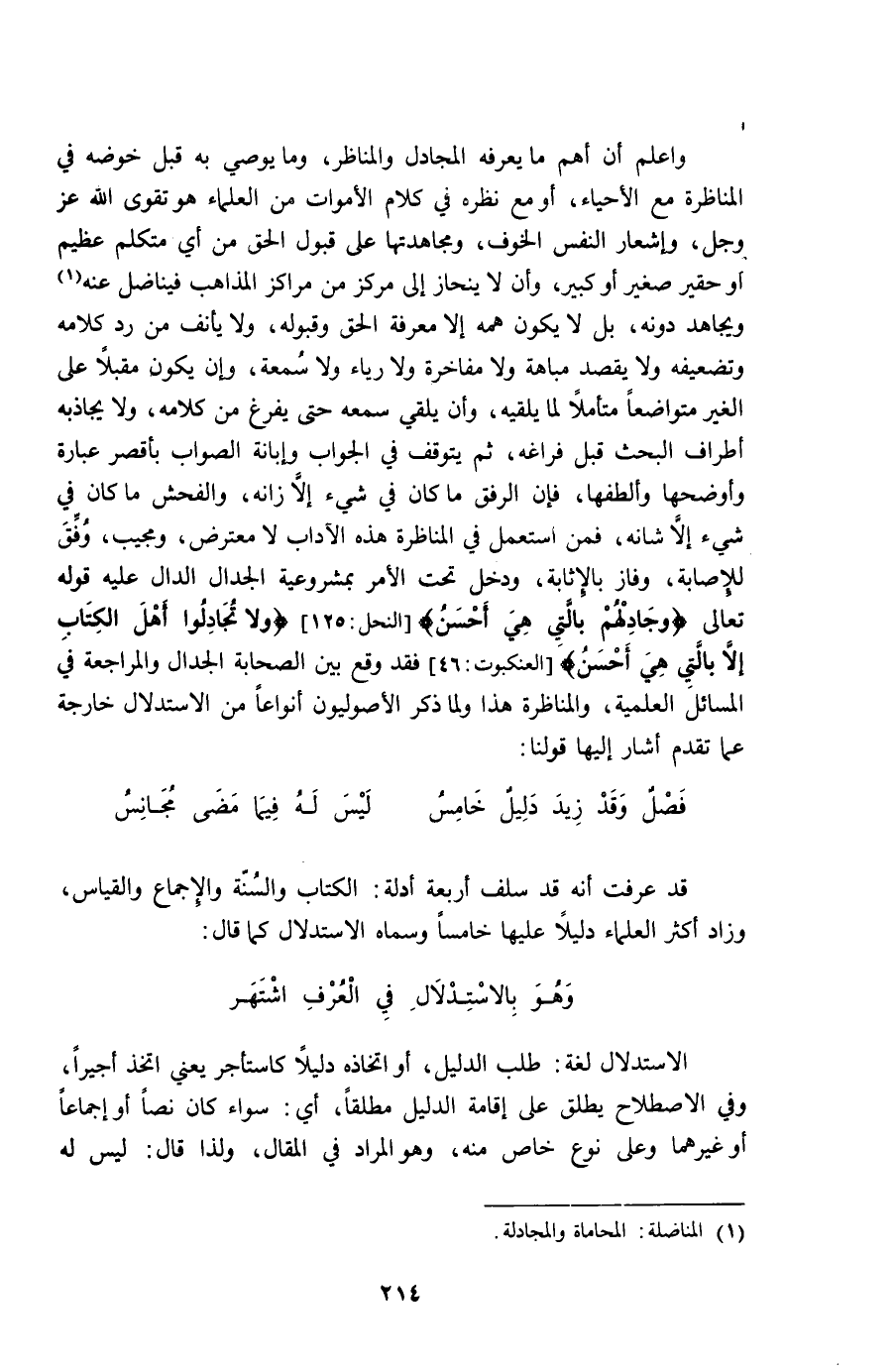 وَاعْلَم أَن أهم مَا يعرفهُ المجادل والمناظر وَمَا يُوصي بِهِ قبل خوضه فِي المناظرة مَعَ الْأَحْيَاء أَو مَعَ نظره فِي كَلَام الْأَمْوَات من الْعلمَاء هُوَ تقوى الله عز وَجل وإشعار النَّفس الْخَوْف ومجاهدتها على قبُول الْحق من أَي مُتَكَلم عَظِيم أَو حقير صَغِير أَو كَبِير وَأَن لَا ينحاز إِلَى مَرْكَز من مراكز الْمذَاهب فيناضل عَنهُ ويجاهد دونه بل لَا يكون همه إِلَّا معرفَة الْحق وقبوله وَلَا يأنف من رد كَلَامه وتضعيفه وَلَا يقْصد مباهة وَلَا مفاخرة وَلَا رِيَاء وَلَا سمعة وَإِن يكون مُقبلا على الْغَيْر متواضعا متأملا لما يلقيه وَأَن يلقِي سَمعه حَتَّى يفرغ من كَلَامه وَلَا يجاذبه أَطْرَاف الْبَحْث قبل فَرَاغه ثمَّ يتَوَقَّف فِي الْجَواب وإبانة الصَّوَاب بأقصر عبارَة وأوضحها وألطفها فَإِن الرِّفْق مَا كَانَ فِي شَيْء إِلَّا زانه وَالْفُحْش مَا كَانَ فِي شَيْء إِلَّا شانه فَمن اسْتعْمل فِي المناظرة هَذِه الْآدَاب لَا معترض ومجيب وفْق للإصابة وفاز بِالْإِثَابَةِ وَدخل تَحت الامر بمشروعية الْجِدَال الدَّال عَلَيْهِ قَوْله تَعَالَى {وجادلهم بِالَّتِي هِيَ أحسن} {وَلَا تجادلوا أهل الْكتاب إِلَّا بِالَّتِي هِيَ أحسن} فِي الْمسَائِل العلمية والمناظرة هَذَا وَلما ذكر الأصوليون أنواعا من الِاسْتِدْلَال خَارِجَة عَمَّا تقدم أَشَارَ إِلَيْهَا قَوْلنَا ... فصل وَقد زيد دَلِيل خَامِس ... لَيْسَ لَهُ فِيمَا مضى مجانس ...