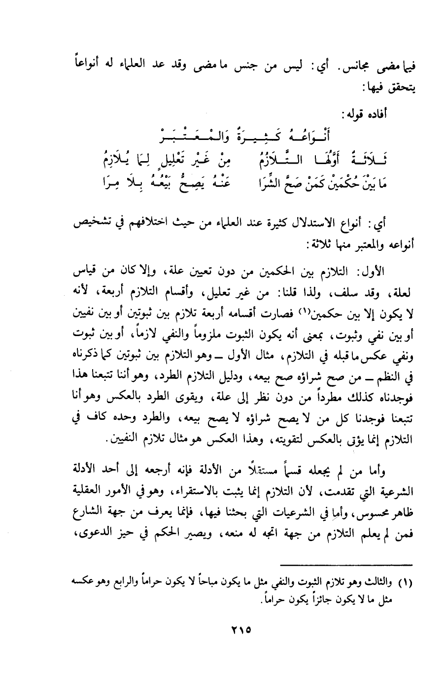 الأول التلازم بَين الْحكمَيْنِ من دون تعْيين عِلّة وَإِلَّا كَانَ من قِيَاس الْعلَّة وَقد سلف وَلذَا قُلْنَا من غير تَعْلِيل وأقسام التلازم أَرْبَعَة لِأَنَّهُ لَا يكون إِلَّا بَين حكمين فَصَارَت أقسامه أَرْبَعَة تلازم بَين ثبوتين أَو بَين نفيين أَو بَين نفي وَثُبُوت بِمَعْنى أَنه يكون الثُّبُوت ملزوما وَالنَّفْي لَازِما أَو بَين ثُبُوت وَنفي عكس مَا قبله فِي التلازم مِثَال الأول وَهُوَ التلازم بَين ثبوتين كَمَا ذَكرْنَاهُ فِي النّظم من صَحَّ شِرَاؤُهُ صَحَّ بَيْعه وَدَلِيل التلازم الطَّرْد وَهُوَ أننا تتبعنا هَذَا فوجدناه كَذَلِك مطردا من دون نظر إِلَى عِلّة ويقوى الطَّرْد بِالْعَكْسِ وَهُوَ انا تتبعنا فَوَجَدنَا كل من لَا يَصح شِرَاؤُهُ لَا يَصح بَيْعه والطرد وَحده كَاف فِي التلازم إِنَّمَا يُؤْتى بِالْعَكْسِ لتقويته وَهَذَا الْعَكْس هُوَ مِثَال تلازم النفيين