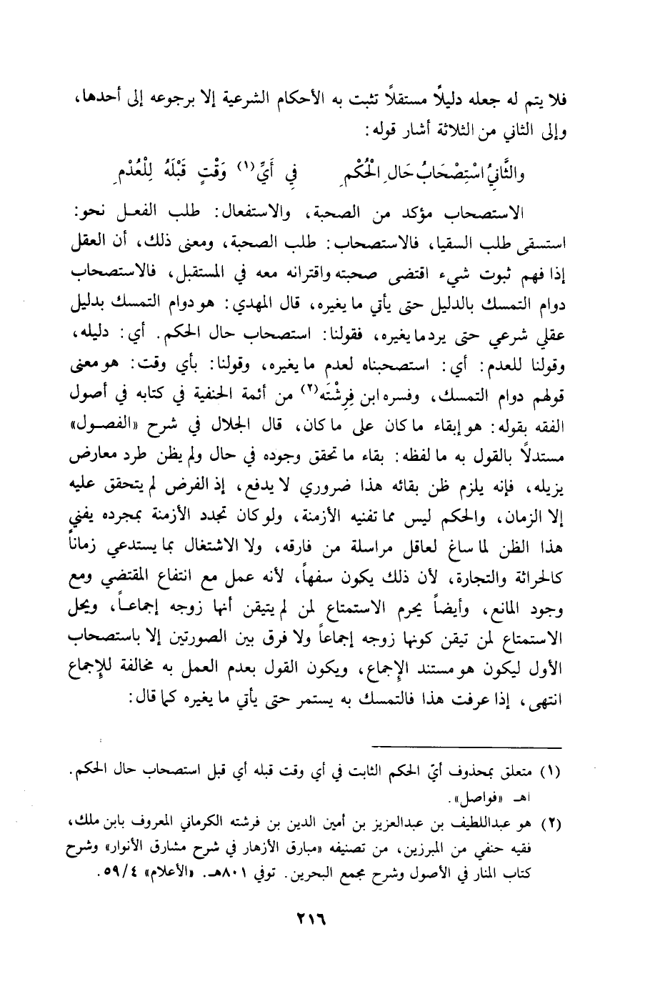 فَلَا يتم لَهُ جعله دَلِيلا مُسْتقِلّا تثبت بِهِ الْأَحْكَام الشَّرْعِيَّة إِلَّا بِرُجُوعِهِ إِلَى أَحدهَا وَإِلَى الثَّانِي من الثَّلَاثَة أَشَارَ قَوْله ... وَالثَّانِي اسْتِصْحَاب حَال الحكم ... فِي أَي وَقت قبله للعدم ...