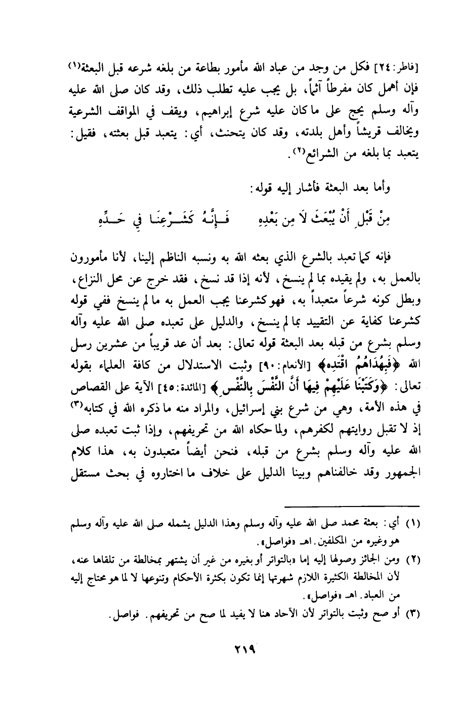 فَإِنَّهُ كَمَا تعبد بِالشَّرْعِ الَّذِي بَعثه الله بِهِ وَنسبه النَّاظِم إِلَيْنَا لأَنا مأمورون بِالْعَمَلِ بِهِ وَلم يُقَيِّدهُ بِمَا لم ينْسَخ لِأَنَّهُ إِذا قد نسخ فقد خرج عَن مَحل النزاع وَبَطل كَونه شرعا متعبدا بِهِ فَهُوَ كشرعنا يجب الْعَمَل بِهِ مَا لم ينْسَخ فَفِي قَوْله كشرعنا كِفَايَة عَن التَّقْيِيد بِمَا لم ينْسَخ وَالدَّلِيل على تعبده صلى الله عَلَيْهِ وَسلم بشرع من قبله بعد الْبعْثَة قَوْله تَعَالَى بعد أَن عد قَرِيبا من عشْرين رسل الله {فبهداهم اقتده} وَثَبت الِاسْتِدْلَال من كَافَّة الْعلمَاء بقوله تَعَالَى {وكتبنا عَلَيْهِم فِيهَا أَن النَّفس بِالنَّفسِ} الْآيَة على الْقصاص فِي هَذِه الْأمة وَهِي من شرع بني إِسْرَائِيل وَالْمرَاد مِنْهُ مَا ذكره الله فِي كِتَابه إِذْ لَا تقبل روايتهم لكفرهم وَلما حَكَاهُ الله من تحريفهم وَإِذا ثَبت تعبده صلى الله عَلَيْهِ وَسلم بشرع من قبله فَنحْن أَيْضا متعبدون بِهِ هَذَا كَلَام الْجُمْهُور وَقد خالفناهم وَبينا الدَّلِيل على خلاف مَا اختاروه فِي بحث مُسْتَقل