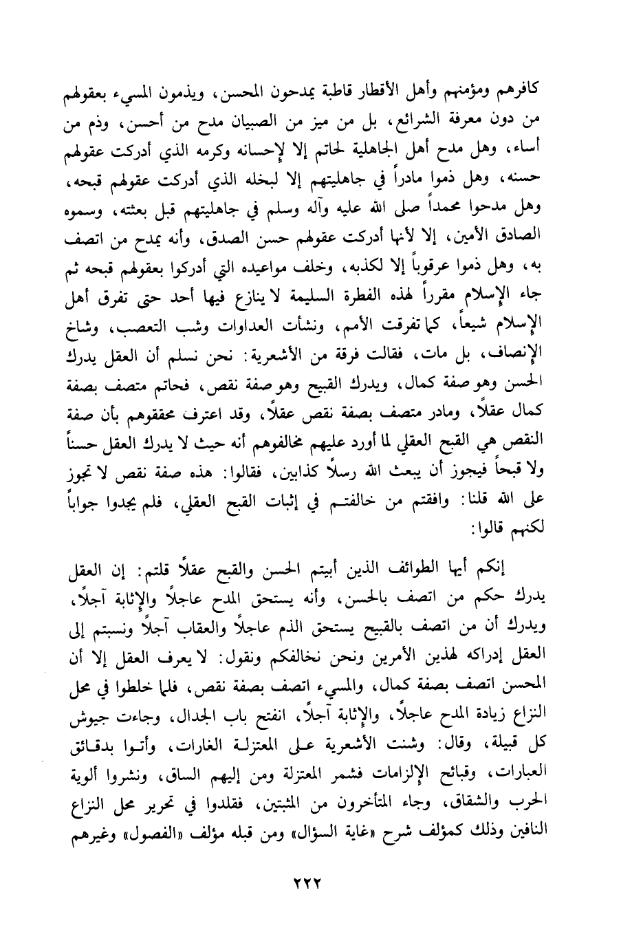 إِنَّكُم أَيهَا الطوائف الَّذين أَبَيْتُم الْحسن والقبح عقلا قُلْتُمْ إِن الْعقل يدْرك حكم من اتّصف بالْحسنِ وَأَنه يسْتَحق الْمَدْح عَاجلا والإثابة آجلا وَيدْرك أَن من اتّصف بالقبيح يسْتَحق الذَّم عَاجلا وَالْعِقَاب آجلا ونسبتم إِلَى الْعقل إِدْرَاكه لهذين الْأَمريْنِ وَنحن نخالفكم ونقول لَا يعرف الْعقل إِلَّا أَن المحسن اتّصف بِصفة كَمَال والمسيء اتّصف بِصفة نقص فَلَمَّا خلطوا فِي مَحل النزاع زِيَادَة الْمَدْح عَاجلا والإثابة آجلا انْفَتح بَاب الْجِدَال وَجَاءَت جيوش كل قَبيلَة وَقَالَ وشنت الأشعرية على الْمُعْتَزلَة الغارات وَأتوا بدقائق الْعبارَات وقبائح الإلزامات فشمر الْمُعْتَزلَة وَمن إِلَيْهِم السَّاق ونشروا ألوية الْحَرْب والشقاق وَجَاء الْمُتَأَخّرُونَ من المثبتين فقلدوا فِي تَحْرِير مَحل النزاع النافين وَذَلِكَ كمؤلف شرح غَايَة السُّؤَال وَمن قبله مؤلف الْفُصُول وَغَيرهم