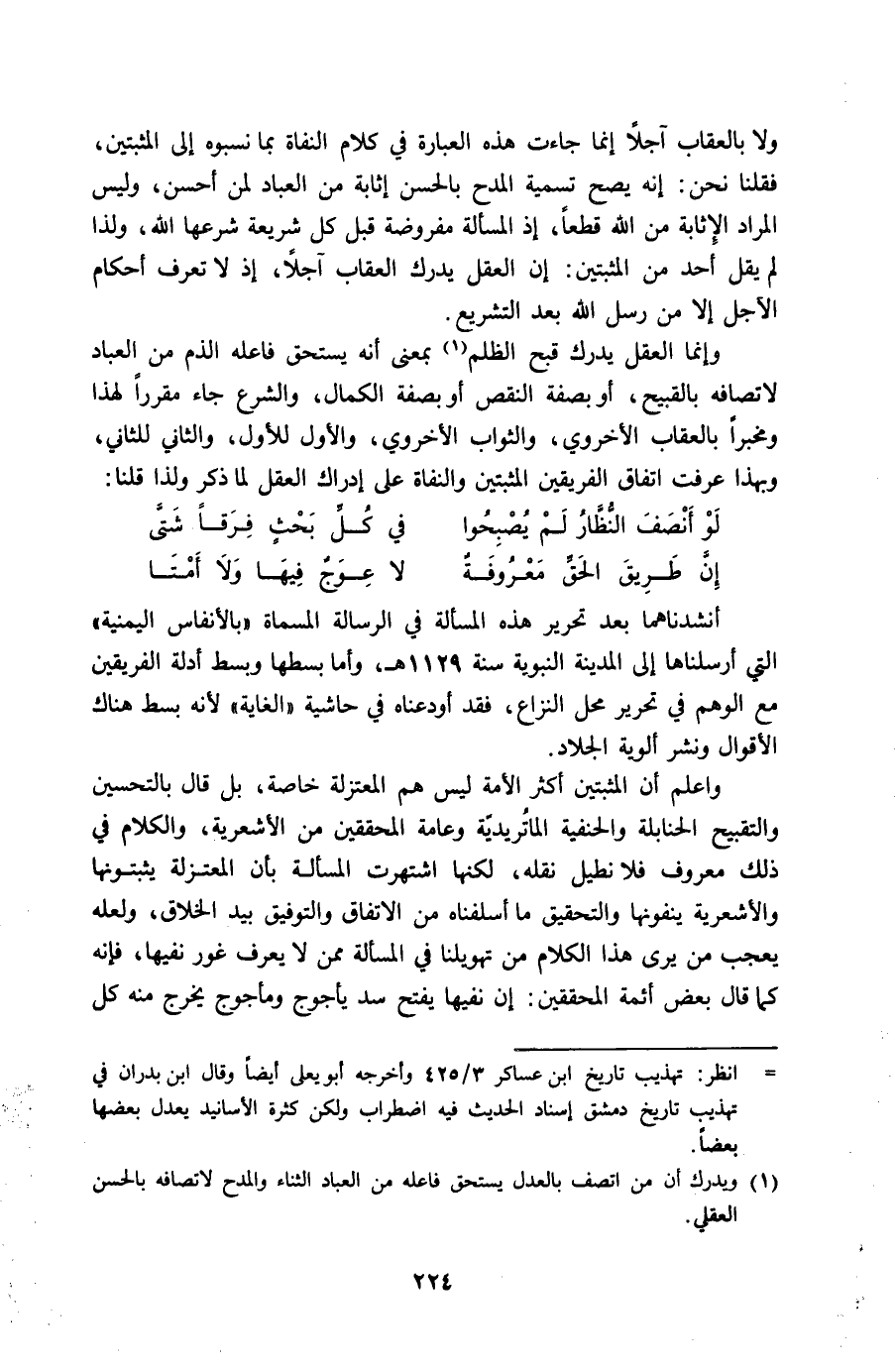 وَلَا بالعقاب آجلا إِنَّمَا جَاءَت هَذِه الْعبارَة فِي كَلَام النفاة بِمَا نسبوه إِلَى المثبتين فَقُلْنَا نَحن إِنَّه يَصح تَسْمِيَة الْمَدْح بالْحسنِ إثابة من الْعباد لمن أحسن وَلَيْسَ المُرَاد الإثابة من الله قطعا إِذْ الْمَسْأَلَة مَفْرُوضَة فِي كل شَرِيعَة شرعها الله وَلذَا لم يقل أحد من المثبتين إِن الْعقل يدْرك الْعقَاب آجلا إِذْ لَا تعرف أَحْكَام الآجل إِلَّا من رسل الله بعد التشريع
