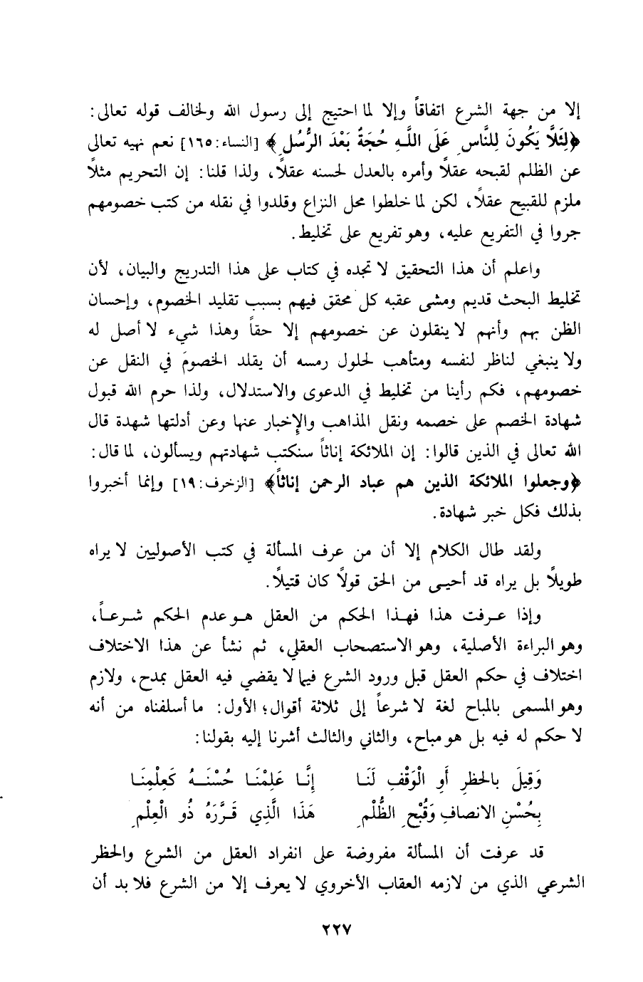إِلَّا من جِهَة الشَّرْع اتِّفَاقًا وَإِلَّا لما احْتِيجَ إِلَى رَسُول الله ولخالف قَوْله تَعَالَى {لِئَلَّا يكون للنَّاس على الله حجَّة بعد الرُّسُل} نعم نَهْيه تَعَالَى عَن الظُّلم لقبحه عقلا وَأمره بِالْعَدْلِ لحسنه عقلا وَلذَا قُلْنَا إِن التَّحْرِيم مثلا مُلْزم للقبيح عقلا لَكِن لما خلطوا مَحل النزاع وقلدوا فِي نَقله من كتب خصومهم جروا فِي التَّفْرِيع عَلَيْهِ وَهُوَ تَفْرِيع على تَخْلِيط