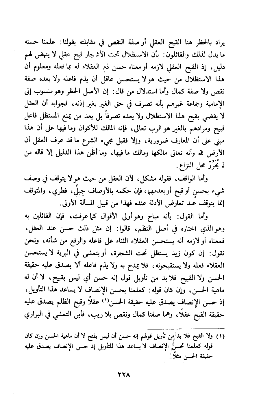 يُرَاد بالحظر هُنَا الْقبْح الْعقلِيّ أَو صفة النَّقْص فِي مُقَابلَته بقولنَا علمنَا حسنه مَا يدل لذَلِك الْقَائِلُونَ بِأَن الاستظلال تَحت الْأَشْجَار قبح عَقْلِي لَا ينْهض لَهُم دَلِيل إِذْ الْقبْح الْعقلِيّ لَازمه أَو مَعْنَاهُ حسن ذمّ الْعُقَلَاء لَهُ بِمَا فعله وَمَعْلُوم أَن هَذَا الاستظلال من حَيْثُ هُوَ لَا يستحسن عَاقل أَن يذم فَاعله وَلَا يعده صفة نقص وَلَا صفة كَمَال وَأما اسْتِدْلَال من قَالَ إِن الأَصْل الْحَظْر وَهُوَ مَنْسُوب إِلَى الإمامية وَجَمَاعَة غَيرهم بِأَنَّهُ تصرف فِي حق الْغَيْر بِغَيْر إِذْنه فجوابة أَن الْعقل لَا يقْضِي بقبح هَذَا الاستظلال وَلَا يعده تَصرفا بل يعد من يمْنَع المستظل فَاعل قَبِيح ومرادهم بِالْغَيْر هُوَ الرب تَعَالَى فَإِنَّهُ الْمَالِك للأكوان وَمَا فِيهَا على أَن هَذَا مَبْنِيّ على أَن المعارف ضَرُورِيَّة وَإِلَّا فَقيل مَجِيء الشَّرْع مَا قد عرف الْعقل أَن الأَرْض لله وَأَنه تَعَالَى مَالِكهَا وَمَالك مَا فِيهَا وَمَا أَظن هَذَا الدَّلِيل إِلَّا قَالَه من لم يحرر مَحل النزاع
