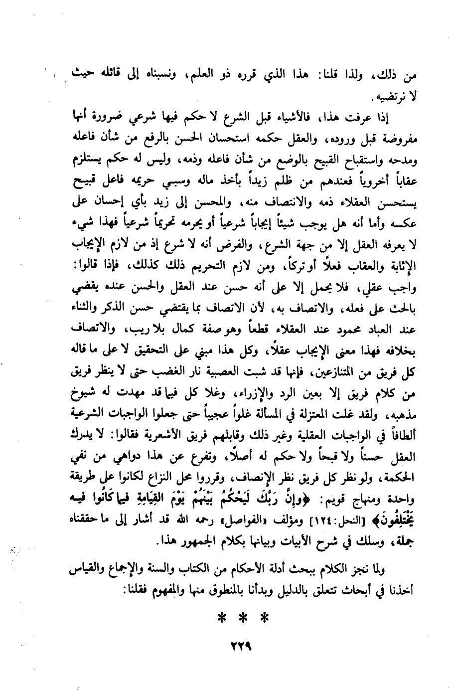 إِذا عرفت هَذَا فالأشياء قبل الشَّرْع لَا حكم فِيهَا شَرْعِي ضَرُورَة أَنَّهَا مَفْرُوضَة قبل وُرُوده وَالْعقل حكمه اسْتِحْسَان الْحسن بِالرَّفْع من شَأْن فَاعله ومدحه واستقباح الْقَبِيح بِالْوَضْعِ من شَأْن فَاعله وذمه وَلَيْسَ لَهُ حكم يسْتَلْزم عقَابا أخرويا فعندهم من ظلم زيدا بِأخذ مَاله وَسبي حريمه فَاعل قَبِيح يستحسن الْعُقَلَاء ذمه والانتصاف مِنْهُ والمحسن إِلَى زيد بِأَيّ إِحْسَان على عَكسه وَأما أَنه هَل يُوجب شَيْئا إِيجَابا شَرْعِيًّا أَو يحرمه تَحْرِيمًا شَرْعِيًّا فَهَذَا شَيْء لَا يعرفهُ الْعقل إِلَّا من جِهَة الشَّرْع وَالْفَرْض أَنه لَا شرع إِذْ من لَازم الْإِيجَاب الإثابة وَالْعِقَاب فعلا أَو تركا وَمن لَازم التَّحْرِيم ذَلِك كَذَلِك فَإِذا قَالُوا وَاجِب عَقْلِي فَلَا يحمل إِلَّا على أَنه حسن عِنْد الْعقل وَالْحسن عِنْده يقْضِي بالحث على فعله والاتصاف بِهِ لِأَن الاتصاف بِمَا يَقْتَضِي حسن الذّكر وَالثنَاء عِنْد الْعباد مَحْمُود عِنْد الْعُقَلَاء قطعا وَهُوَ صفة كَمَال بِلَا ريب والاتصاف بِخِلَافِهِ فَهَذَا معنى الْإِيجَاب عقلا وكل هَذَا مَبْنِيّ على التَّحْقِيق لَا على مَا قَالَه كل فريق من المتنازعين فَإِنَّهَا قد شبت العصبية نَار الْغَضَب حَتَّى لَا ينظر فريق من كَلَام فريق إِلَّا بِعَين الرَّد والإزراء وغلا كل فِيمَا قد مهدت لَهُ شُيُوخ مذْهبه وَلَقَد غلت الْمُعْتَزلَة فِي الْمَسْأَلَة غلوا عجيبا حَتَّى جعلُوا الْوَاجِبَات الشَّرْعِيَّة ألطافا فِي الْوَاجِبَات الْعَقْلِيَّة وَغير ذَلِك وقابلهم فريق الأشعرية فَقَالُوا لَا يدْرك الْعقل حسنا وَلَا قبحا وَلَا حكم لَهُ أصلا وتفرع عَن هَذَا دواهي من نفي الْحِكْمَة وَلَو نظر كل فريق نظر الْإِنْصَاف وقرروا مَحل النزاع لكانوا على طَريقَة وَاحِدَة ومنهاج قويم {وَإِن رَبك ليحكم بَينهم يَوْم الْقِيَامَة فِيمَا كَانُوا فِيهِ يَخْتَلِفُونَ} ومؤلف الفواصل رَحمَه الله قد أَشَارَ إِلَى مَا حققناه جملَة وسلك فِي شرح الأبيات وبيانها بِكَلَام الْجُمْهُور هَذَا