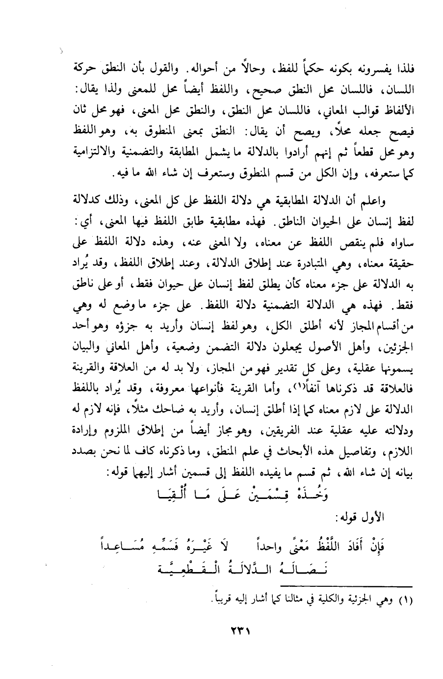 وَاعْلَم أَن الدّلَالَة المطابقية هِيَ دلَالَة اللَّفْظ على كل معنى وَذَلِكَ كدلالة لفظ إِنْسَان على الْحَيَوَان النَّاطِق فَهَذِهِ مطابقية طابق اللَّفْظ فِيهَا الْمَعْنى أَي ساواه فَلم ينقص اللَّفْظ عَن مَعْنَاهُ وَلَا الْمَعْنى عَنهُ وَهَذِه دلَالَة اللَّفْظ على حَقِيقَة مَعْنَاهُ وَهِي المتبادرة عِنْد إِطْلَاق الدّلَالَة وَعند إِطْلَاق اللَّفْظ وَقد يُرَاد بِهِ الدّلَالَة على جُزْء مَعْنَاهُ كَأَن يُطلق لفظ إِنْسَان على حَيَوَان فَقَط أَو على نَاطِق فَقَط فَهَذِهِ هِيَ الدّلَالَة التضمنية دلَالَة اللَّفْظ على جُزْء مَا وضع لَهُ وَهِي من أَقسَام الْمجَاز لِأَنَّهُ أطلق الْكل وَهُوَ لفظ إِنْسَان وَأُرِيد بِهِ جزؤه وَهُوَ أحد الجزئين وَأهل الْأُصُول يجْعَلُونَ دلَالَة التضمن وضعية وَأهل الْمعَانِي وَالْبَيَان يسمونها عقلية وعَلى كل تَقْدِير فَهُوَ من الْمجَاز وَلَا بُد لَهُ من العلاقة والقرينة فالعلاقة قد ذَكرنَاهَا آنِفا وَأما الْقَرِينَة فأنواعها مَعْرُوفَة وَقد يُرَاد بِاللَّفْظِ الدّلَالَة على لَازم مَعْنَاهُ كَمَا إِذا أطلق إِنْسَان وَأُرِيد بِهِ ضَاحِك مثلا فَإِنَّهُ لَازم لَهُ ودلالته عَلَيْهِ عقلية عِنْد الْفَرِيقَيْنِ وَهُوَ مجَاز أَيْضا من إِطْلَاق الْمَلْزُوم وَإِرَادَة اللَّازِم وتفاصيل هَذِه الأبحاث فِي علم الْمنطق وَمَا ذَكرْنَاهُ كَاف لما نَحن بصدد بَيَانه إِن شَاءَ الله ثمَّ قسم مَا يفِيدهُ اللَّفْظ إِلَى قسمَيْنِ أَشَارَ إِلَيْهِمَا قَوْله