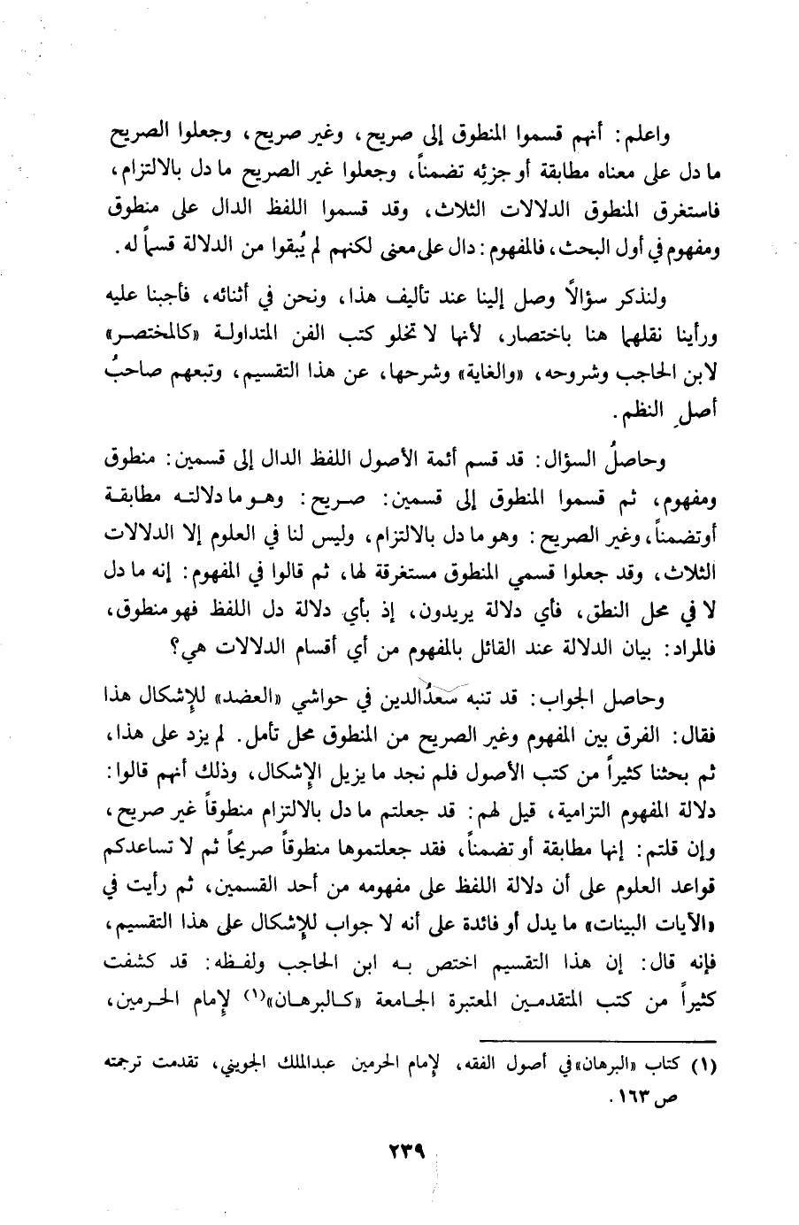 وَحَاصِل الْجَواب قد تنبه سعدالدين فِي حَوَاشِي الْعَضُد للإشكال هَذَا فَقَالَ الْفرق بَين الْمَفْهُوم وَغير الصَّرِيح من الْمَنْطُوق مَحل تَأمل لم يزدْ على هَذَا ثمَّ بحثنا كثيرا من كتب الْأُصُول فَلم نجد مَا يزِيل الْإِشْكَال وَذَلِكَ أَنهم قَالُوا دلَالَة الْمَفْهُوم التزامية قيل لَهُم قد جعلتم مَا دلّ بالالتزام منطوقا غير صَرِيح وَإِن قُلْتُمْ إِنَّهَا مُطَابقَة أَو تضمنا فقد جعلتموها منطوقا صَرِيحًا ثمَّ لَا تساعدكم قَوَاعِد الْعُلُوم على أَن دلَالَة اللَّفْظ على مَفْهُومه من أحد الْقسمَيْنِ ثمَّ رَأَيْت فِي الْآيَات الْبَينَات مَا يدل أَو فَائِدَة على أَنه لَا جَوَاب للإشكال على هَذَا التَّقْسِيم فَإِنَّهُ قَالَ إِن هَذَا التَّقْسِيم اخْتصَّ بِهِ ابْن الْحَاجِب وَلَفظه قد كشفت كثيرا من كتب الْمُتَقَدِّمين الْمُعْتَبرَة الجامعة كالبرهان لإِمَام الْحَرَمَيْنِ