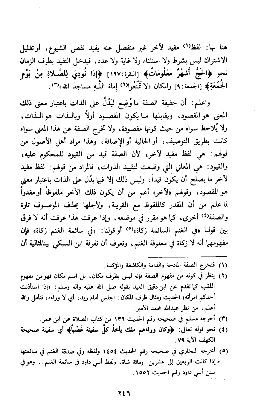 وَاعْلَم أَن حَقِيقَة الصّفة مَا وضع ليدل على الذَّات بِاعْتِبَار معنى ذَلِك الْمَعْنى هُوَ الْمَقْصُود ويقابلها مَا يكون الْمَقْصُود أَولا وبالذات هُوَ الذَّات وَلَا يُلَاحظ سواهُ من حَيْثُ كَونهَا مَقْصُودَة وَلَا تخرج الصّفة عَن هَذَا الْمَعْنى سَوَاء كَانَت بطرِيق التوصيف أَو الحالية أَو الْإِضَافَة وَهَذَا مُرَاد أهل الْأُصُول من قَوْلهم هِيَ لفظ مُقَيّد لآخر لِأَن الصّفة قيد من الْقُيُود للمحكوم عَلَيْهِ والقيود هِيَ الْمعَانِي الَّتِي وضعت لتقييد الذوات فَالْمُرَاد من قَوْلهم لفظ مُقَيّد لآخر مَا يصلح أَن يكون قيدا وَلَيْسَ ذَلِك إِلَّا فِيمَا يدل على الذَّات بِاعْتِبَار معنى هُوَ الْمَقْصُود وَقَوْلهمْ لآخر أَعم من أَن يكون ذَلِك الآخر ملفوظا أَو مُقَدرا لما علم من أَن الْمُقدر كالملفوظ مَعَ الْقَرِينَة ولأجلها يحذف الْمَوْصُوف تَارَة وَالصّفة أُخْرَى كَمَا هُوَ مُقَرر فِي مَوْضِعه وَإِذا عرفت هَذَا عرفت أَنه لَا فرق بَين قَوْلنَا فِي الْغنم السَّائِمَة زَكَاة أَو قَوْلنَا فِي سَائِمَة الْغنم زَكَاة فَإِن مفهومها أَنه لَا زَكَاة فِي معلوفة الْغنم وتعرف أَن تَفْرِقَة ابْن السُّبْكِيّ بَينا لماثلية أَن
