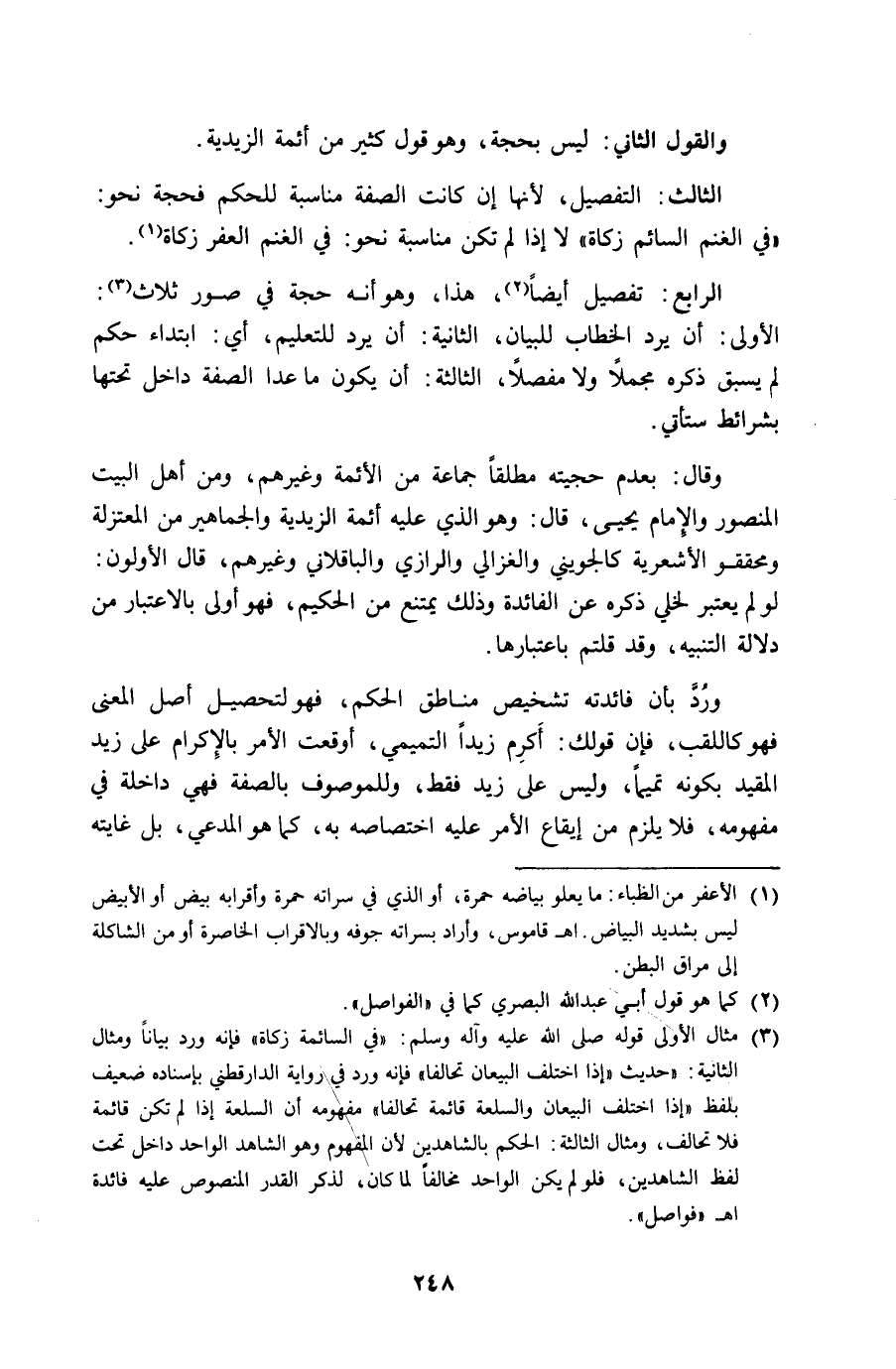 وَقَالَ بِعَدَمِ حجيته مُطلقًا جمَاعَة من الْأَئِمَّة وَغَيرهم وَمن أهل الْبَيْت الْمَنْصُور وَالْإِمَام يحيى قَالَ وَهُوَ الَّذِي عَلَيْهِ أَئِمَّة الزيدية والجماهير من الْمُعْتَزلَة ومحققو الأشعرية كالجويني وَالْغَزالِيّ والرازي والباقلاني وَغَيرهم قَالَ الْأَولونَ لَو لم يعْتَبر لخلي ذكره عَن الْفَائِدَة وَذَلِكَ يمْتَنع من الْحَكِيم فَهُوَ أولى بِالِاعْتِبَارِ من دلَالَة التَّنْبِيه وَقد قُلْتُمْ باعتبارها