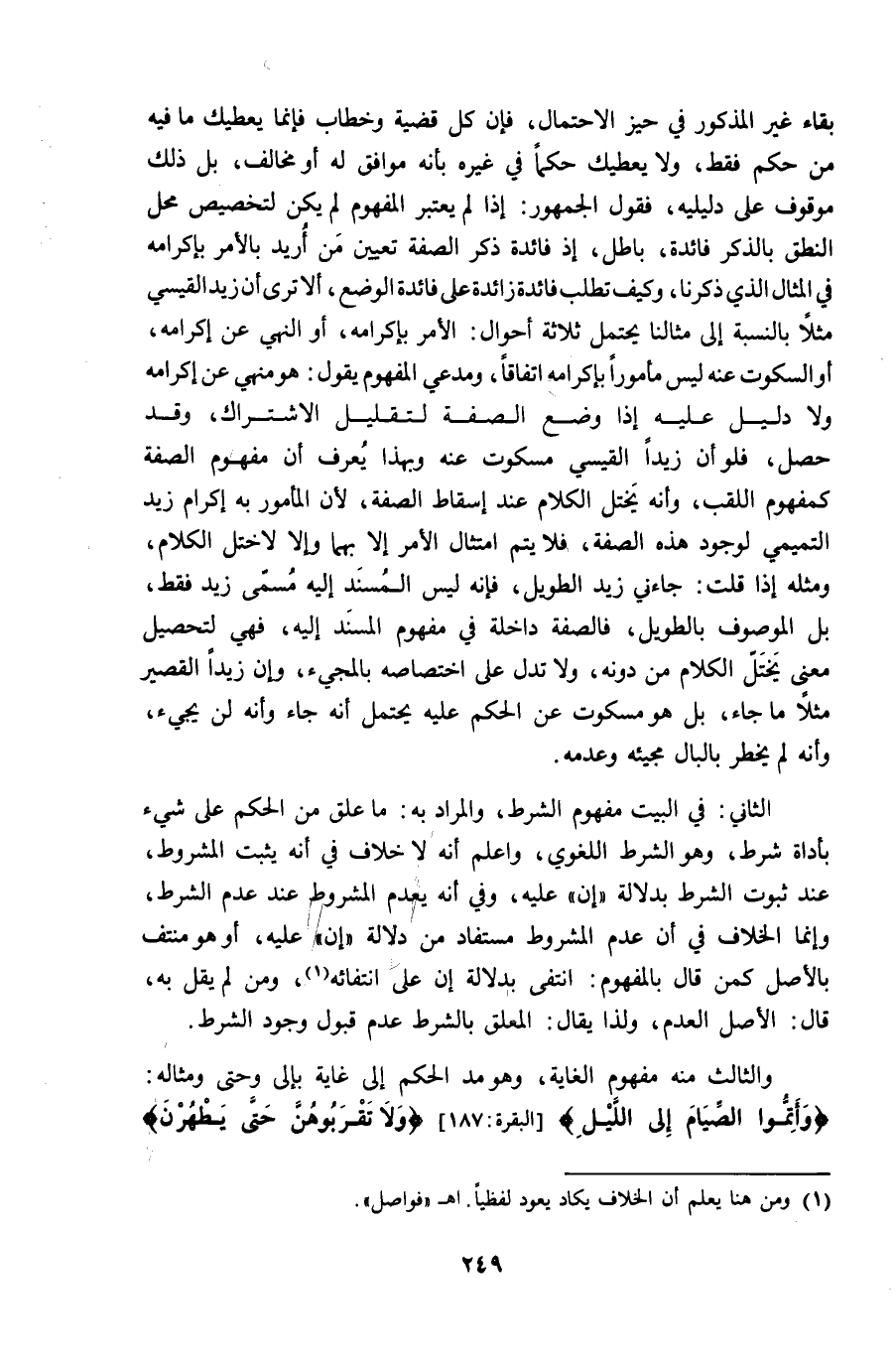 بَقَاء غير الْمَذْكُور فِي حيّز الِاحْتِمَال فَإِن كل قَضِيَّة وخطاب فَإِنَّمَا يعطيك مَا فِيهِ من حكم فَقَط وَلَا يعطيك حكما فِي غَيره بِأَنَّهُ مُوَافق لَهُ أَو مُخَالف بل ذَلِك مَوْقُوف على دليليه فَقَوْل الْجُمْهُور إِذا لم يعْتَبر الْمَفْهُوم لم يكن لتخصيص مَحل النُّطْق بِالذكر فَائِدَة بَاطِل إِذْ فَائِدَة ذكر الصّفة تعْيين من أُرِيد بِالْأَمر بإكرامه فِي الْمِثَال الَّذِي ذكرنَا وَكَيف تطلب فَائِدَة زَائِدَة على فَائِدَة الْوَضع أَلا ترى أَن زيد الْقَيْسِي مثلا بِالنِّسْبَةِ إِلَى مثالنا يحْتَمل ثَلَاثَة أَحْوَال الْأَمر بإكرامه أَو النَّهْي عَن إكرامه أَو السُّكُوت عَنهُ لَيْسَ مَأْمُورا بإكرامه اتِّفَاقًا ومدعي الْمَفْهُوم بقول هُوَ مَنْهِيّ عَن إكرامه وَلَا دَلِيل عَلَيْهِ إِذا وضع الصّفة لتقليل الِاشْتِرَاك وَقد حصل فَلَو أَن زيدا الْقَيْسِي مسكوت عَنهُ وَبِهَذَا يعرف أَن مَفْهُوم الصّفة كمفهوم اللقب وَأَنه يخْتل الْكَلَام عِنْد إِسْقَاط الصّفة لِأَن الْمَأْمُور بِهِ إكرام زيد التَّمِيمِي لوُجُود هَذِه الصّفة فَلَا يتم امْتِثَال الْأَمر إِلَّا بهما وَإِلَّا لاختل الْكَلَام وَمثله إِذا قلت جَاءَنِي زيد الطَّوِيل فَإِنَّهُ لَيْسَ الْمسند إِلَيْهِ مُسَمّى زيد فَقَط بل الْمَوْصُوف بالطويل فالصفة دَاخِلَة فِي مَفْهُوم الْمسند إِلَيْهِ فَهِيَ لتَحْصِيل معنى يخْتل الْكَلَام من دونه وَلَا تدل على اخْتِصَاصه بالمجيء وَإِن زيدا الْقصير مثلا مَا جَاءَ بل هُوَ مسكوت عَن الحكم عَلَيْهِ يحْتَمل أَنه جَاءَ وَأَنه لن يَجِيء وَأَنه لم يخْطر بالبال مَجِيئه وَعَدَمه