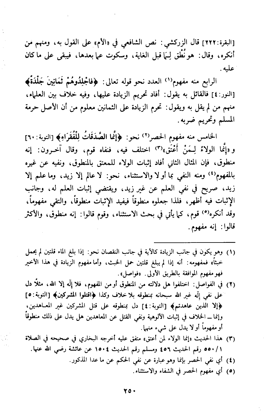 الْخَامِس مِنْهُ مَفْهُوم الْحصْر نَحْو {إِنَّمَا الصَّدقَات للْفُقَرَاء} وَإِنَّمَا الْوَلَاء لمن اعْتِقْ اخْتلف فِيهِ فنفاه قوم وَقَالَ آخَرُونَ إِنَّه مَنْطُوق فَإِن الْمِثَال الثَّانِي أَفَادَ إِثْبَات الْوَلَاء للْمُعْتق بالمنطوق ونفيه عَن غَيره بِالْمَفْهُومِ وَمِنْه النَّفْي بِمَا أَو لَا وَالِاسْتِثْنَاء نَحْو لَا عَالم إِلَّا زيد وَمَا علم إِلَّا زيد صَرِيح فِي نفي الْعلم عَن غير زيد وَيَقْتَضِي إِثْبَات الْعلم لَهُ وجانب الْإِثْبَات فِيهِ أظهر فَلِذَا جَعَلُوهُ منطوقا فَيُفِيد الْإِثْبَات منطوقا والتقي مفهوما وَقد أنكرهُ قوم كَمَا يَأْتِي فِي بحث الِاسْتِثْنَاء وَقوم قَالُوا إِنَّه مَنْطُوق وَالْأَكْثَر قَالُوا إِنَّه مَفْهُوم