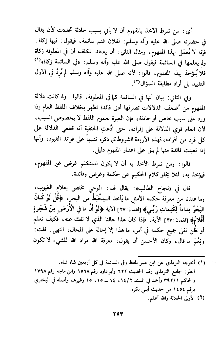 وَفِي الثَّانِي بَيَان أَنَّهَا فِي السَّائِمَة كَمَا فِي المعلوفة قَالُوا وَلما كَانَت دلَالَة الْمَفْهُوم من أَضْعَف الدلالات تصرفها أدنى فَائِدَة تظهر بِخِلَاف اللَّفْظ الْعَام إِذا ورد على سَبَب خَاص أَو حَادِثَة فَإِن الْعبْرَة بِعُمُوم اللَّفْظ لَا بِخُصُوص السَّبَب لِأَن الْعَام قوي الدّلَالَة على إِفْرَاده حَتَّى ادَّعَت الْحَنَفِيَّة أَنه قَطْعِيّ الدّلَالَة على كل فَرد من أَفْرَاده فَهَذِهِ الْأَرْبَعَة الشُّرُوط كَمَا ذكره تَنْبِيها على فَوَائِد الْقُيُود وَأَنَّهَا إِذا تعيّنت فَائِدَة مِنْهَا لم يبْق على اعْتِبَار الْمَفْهُوم دَلِيل