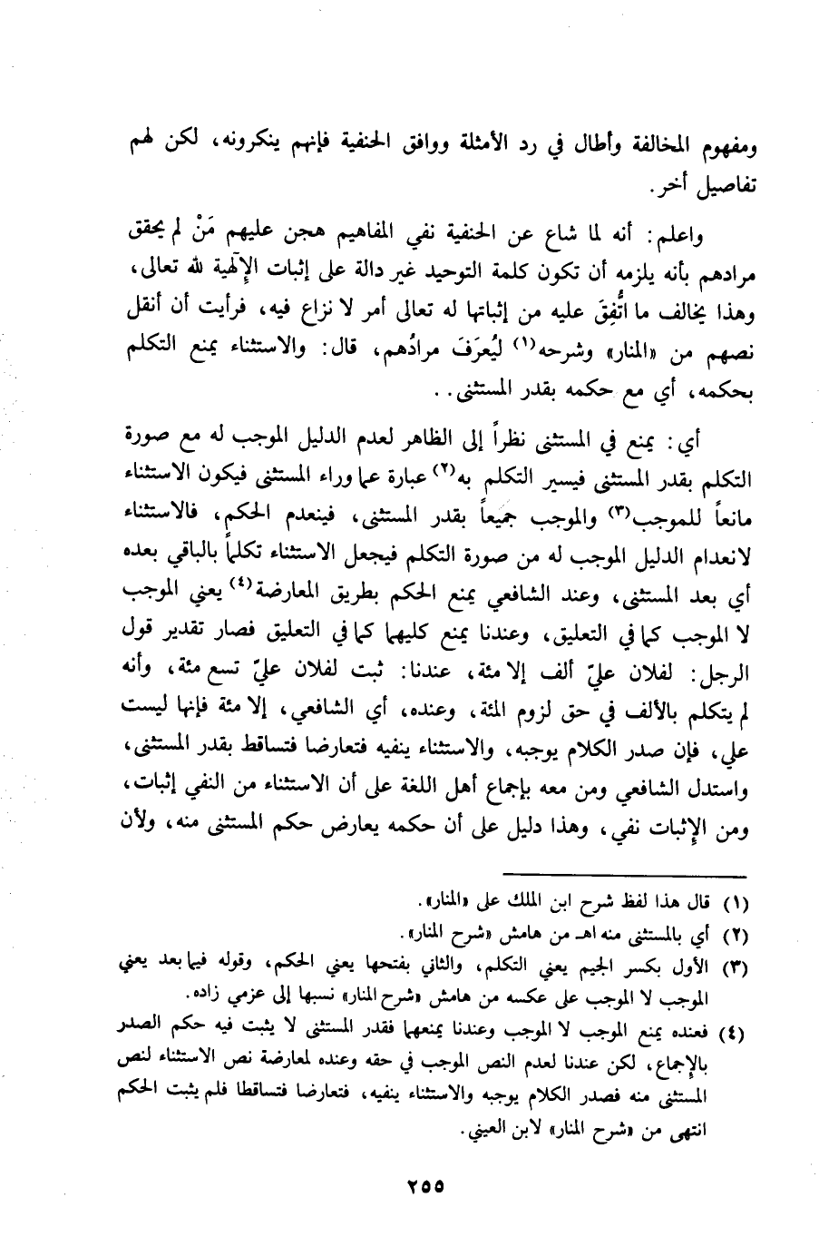 وَاعْلَم أَنه لما شاع عَن الْحَنَفِيَّة نفي المفاهيم هجن عَلَيْهِم من لم يُحَقّق مُرَادهم بِأَنَّهُ يلْزمه أَن تكون كلمة التَّوْحِيد غير دَالَّة على إِثْبَات الإلهية لله تَعَالَى وَهَذَا يُخَالف مَا أتفق عَلَيْهِ من إِثْبَاتهَا لَهُ تَعَالَى أَمر لَا نزاع فِيهِ فرايت أَن أنقل نصهم من الْمنَار وَشَرحه ليعرف مُرَادهم قَالَ وَالِاسْتِثْنَاء يمْنَع التَّكَلُّم بِحكمِهِ أَي مَعَ حكمه بِقدر المستثني