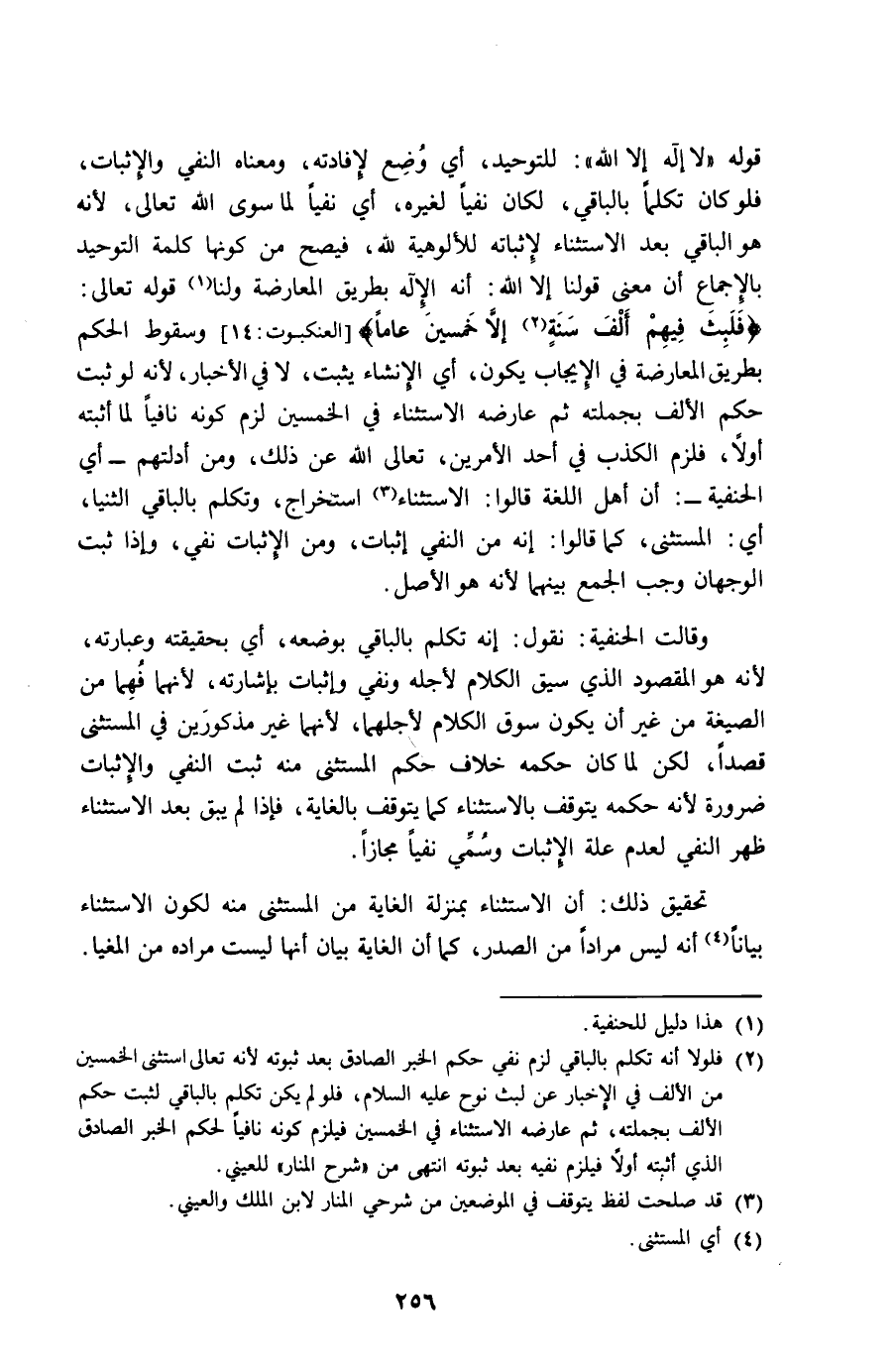 قَوْله لَا إِلَه إِلَّا الله للتوحيد أَي وضع لإفادته وَمَعْنَاهُ النَّفْي وَالْإِثْبَات فَلَو كَانَ تكلما بِالْبَاقِي لَكَانَ نفيا لغيره أَي نفيا لما سوى الله تَعَالَى لِأَنَّهُ هُوَ الْبَاقِي بعد الِاسْتِثْنَاء لإثباته للألوهية لله فَيصح من كَونهَا كلمة التَّوْحِيد بِالْإِجْمَاع أَن معنى قَوْلنَا إِلَّا الله أَنه الْإِلَه بطرِيق الْمُعَارضَة وَلنَا قَوْله تَعَالَى {فَلبث فيهم ألف سنة إِلَّا خمسين عَاما} وَسُقُوط الحكم بطرِيق الْمُعَارضَة فِي الْإِيجَاب يكون أَي الْإِنْشَاء يثبت لَا فِي الْأَخْبَار لِأَنَّهُ لَو ثَبت حكم الْألف بجملته ثمَّ عَارضه الِاسْتِثْنَاء فِي الْخمسين لزم كَونه نافيا لما أثْبته أَولا فَلَزِمَ الْكَذِب فِي أحد الْأَمريْنِ تَعَالَى الله عَن ذَلِك وَمن أدلتهم أَي الْحَنَفِيَّة أَن أهل اللُّغَة قَالُوا الِاسْتِثْنَاء اسْتِخْرَاج وَتكلم بِالْبَاقِي الثنيا أَي الْمُسْتَثْنى كَمَا قَالُوا إِنَّه من النَّفْي إِثْبَات وَمن الْإِثْبَات نفي وَإِذا ثَبت الْوَجْهَانِ وَجب الْجمع بَينهمَا لانه هُوَ الأَصْل