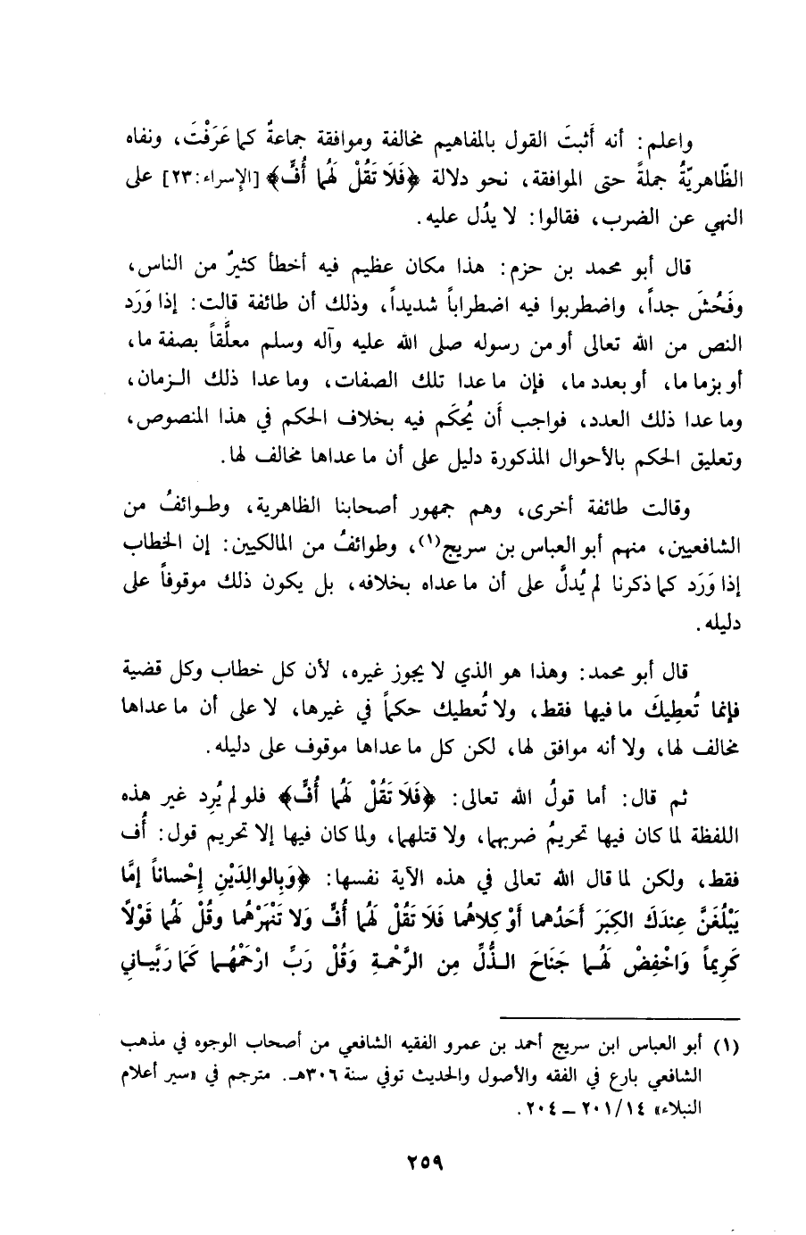 ثمَّ قَالَ أما قَول الله تَعَالَى {فَلَا تقل لَهما أُفٍّ} فَلم يرد غير هَذِه اللَّفْظَة لما كَانَ فِيهَا تَحْرِيم ضربهَا وَلَا قَتلهمَا وَلما كَانَ فِيهَا إِلَّا تَحْرِيم قَول أُفٍّ فَقَط وَلَكِن لما قَالَ الله تَعَالَى فِي هَذِه الْآيَة نَفسهَا {وبالوالدين إحسانا إِمَّا يبلغن عنْدك الْكبر أَحدهمَا أَو كِلَاهُمَا فَلَا تقل لَهما أُفٍّ وَلَا تنهرهما وَقل لَهما قولا كَرِيمًا واخفض لَهما جنَاح الذل من الرَّحْمَة وَقل رب ارحمهما كَمَا ربياني صَغِيرا}