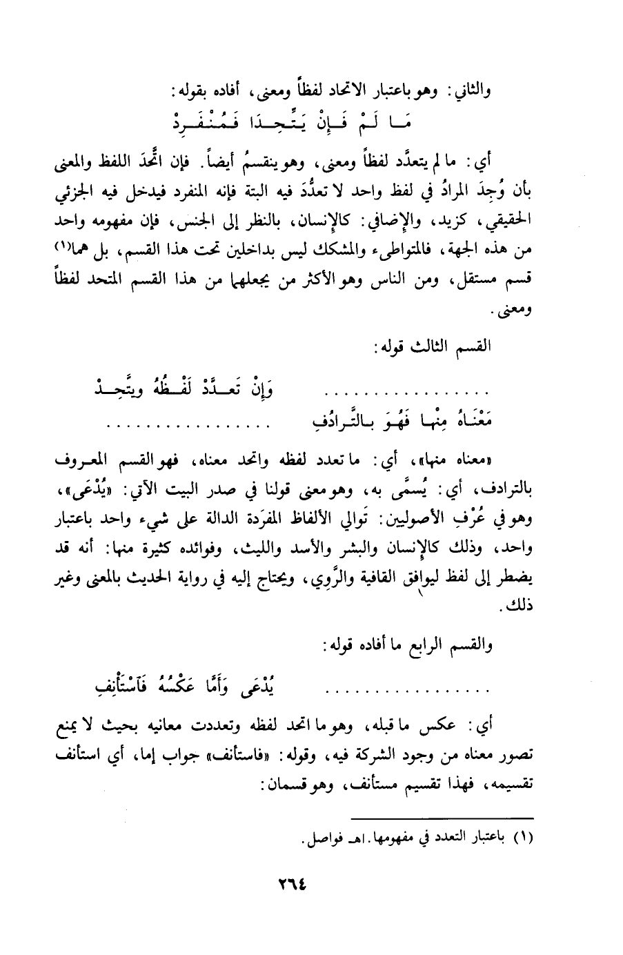 مَعْنَاهُ مِنْهَا أَي مَا تعدد لَفظه واتحد مَعْنَاهُ فَهُوَ الْقسم الْمَعْرُوف بالترادف أَي يُسمى بِهِ وَهُوَ معنى قَوْلنَا فِي صدر الْبَيْت الْآتِي يدعى وَهُوَ فِي عرف الْأُصُولِيِّينَ توالي الْأَلْفَاظ المفردة الدَّالَّة على شَيْء وَاحِد بِاعْتِبَار وَاحِد وَذَلِكَ كالإنسان والبشر والأسد وَاللَّيْث وفوائده كَثِيرَة مِنْهَا أَنه قد يضْطَر إِلَى لفظ ليُوَافق القافية والروي وَيحْتَاج إِلَيْهِ فِي رِوَايَة الحَدِيث بِالْمَعْنَى وَغير ذَلِك