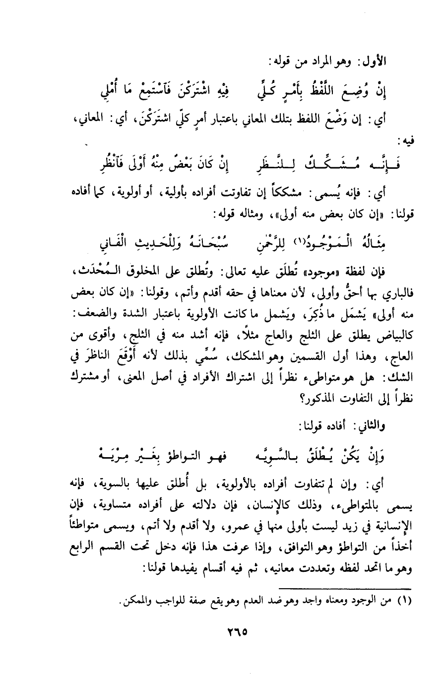 فَإِن لَفْظَة مَوْجُود تطلق عَلَيْهِ تَعَالَى وَتطلق على الْمَخْلُوق الْمُحدث فالباري بهَا أَحَق وَأولى لِأَن مَعْنَاهُ فِي حَقه أقدم وَأتم وَقَوْلنَا إِن كَانَ بعض مِنْهُ أولى يَشْمَل مَا ذكر ويشمل مَا كَانَت الْأَوْلَوِيَّة بِاعْتِبَار الشدَّة والضعف كالبياض يُطلق على الثَّلج والعاج مثلا فَإِنَّهُ أَشد مِنْهُ فِي الثَّلج وَأقوى من العاج وَهَذَا أول الْقسمَيْنِ وَهُوَ المشكك سمي بذلك لِأَنَّهُ أوقع النَّاظر فِي الشَّك هَل هُوَ متواطىء نظرا إِلَى اشْتِرَاك الْأَفْرَاد فِي أصل الْمَعْنى أَو مُشْتَرك نظرا إِلَى التَّفَاوُت الْمَذْكُور