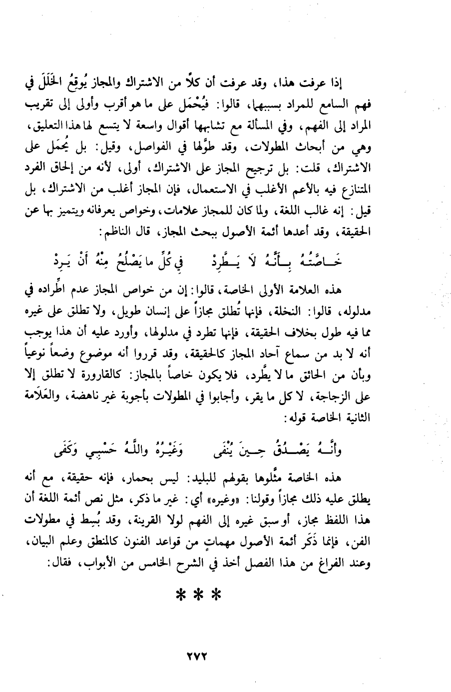 هَذِه الْعَلامَة الأولى الْخَاصَّة قَالُوا إِن من خَواص الْمجَاز عدم اطراده فِي مَدْلُوله قَالُوا النَّخْلَة فَإِنَّهَا تطلق مجَازًا على إِنْسَان طَوِيل وَلَا تطلق على غَيره مِمَّا فِيهِ طول بِخِلَاف الْحَقِيقَة فَإِنَّهَا تطرد فِي مدلولها وَأورد عَلَيْهِ ان هَذَا يُوجب أَنه لَا بُد من سَماع آحَاد الْمجَاز كالحقيقة وَقد قرروا أَنه مَوْضُوع وضعا نوعيا وَبِأَن من الْحَقَائِق مَا لَا يطرد فَلَا يكون خَاصّا بالمجاز كالقارورة لَا تطلق إِلَّا على الزجاجة لَا كل مَا يقر وَأَجَابُوا فِي المطولات بأجوبة غير ناهضة والعلامة الثَّانِيَة الْخَاصَّة قَوْله ... وَأَنه يصدق حِين ينفى ... وَغَيره وَالله حسبي وَكفى ...