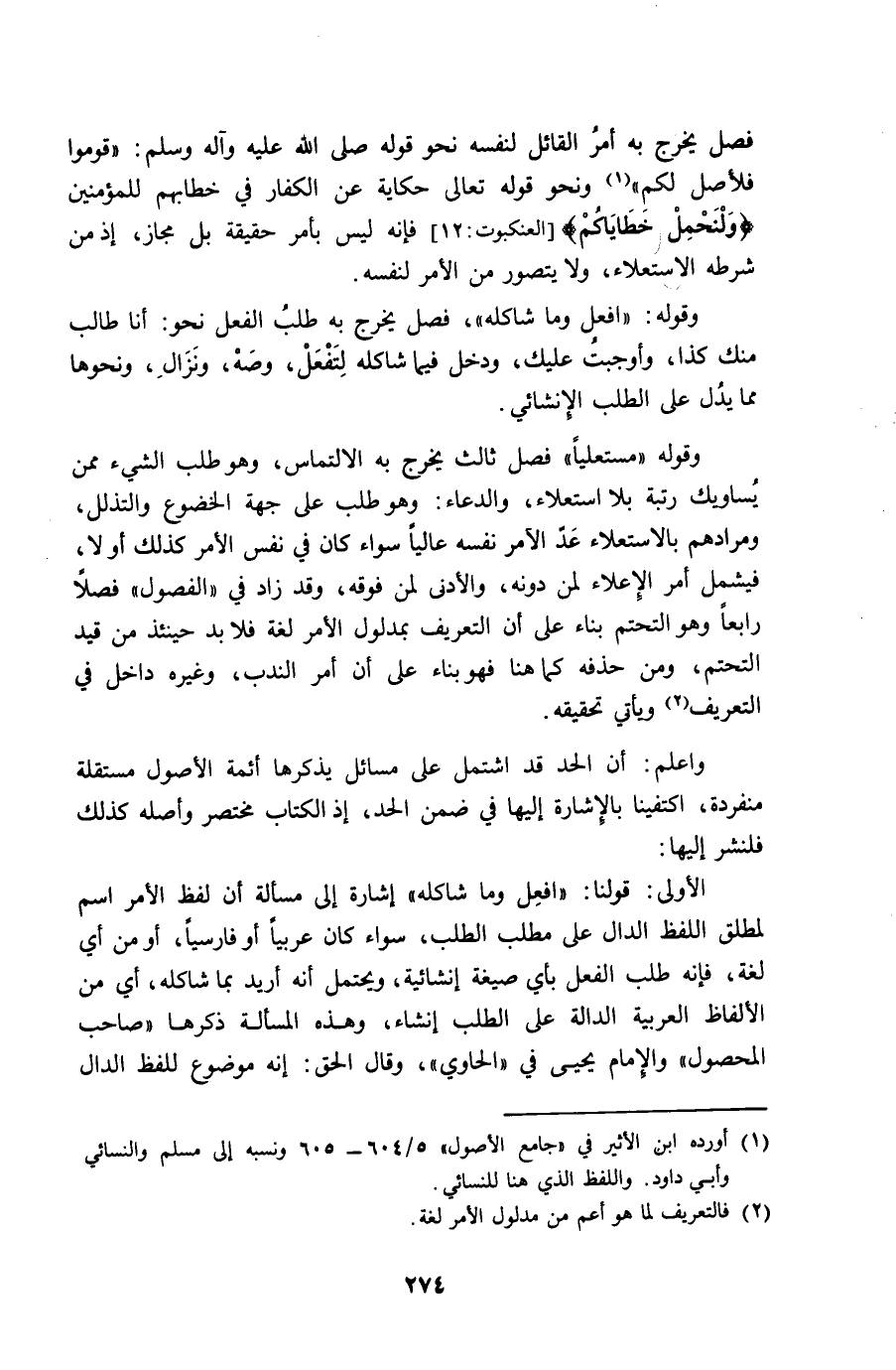 وَقَوله مستعليا فصل ثَالِث يخرج بِهِ الالتماس وَهُوَ طلب الشَّيْء مِمَّن يساويك رُتْبَة بِلَا استعلاء وَالدُّعَاء وَهُوَ طلب على جِهَة الخضوع والتذلل ومرادهم بالاستعلاء عد الْآمِر نَفسه عَالِيا سَوَاء كَانَ فِي نفس الْأَمر كَذَلِك أَولا فَيشْمَل أَمر الإعلاء لمن دونه والأدنى لمن فَوْقه وَقد زَاد فِي الْفُصُول فصلا رَابِعا وَهُوَ التحتم بِنَاء على أَن التَّعْرِيف بمدلول الْأَمر لُغَة فَلَا بُد حِينَئِذٍ من قيد التحتم وَمن حذفه كَمَا هُنَا فَهُوَ بِنَاء على أَن أَمر النّدب وَغَيره دَاخل فِي التَّعْرِيف وَيَأْتِي تَحْقِيقه