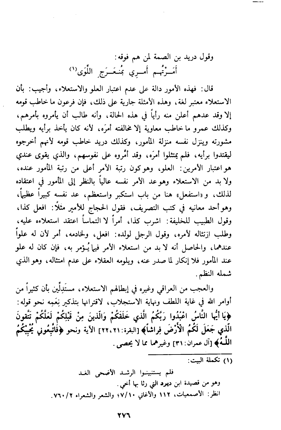 قَالَ فَهَذِهِ الْأُمُور دَالَّة على عدم اعْتِبَار الْعُلُوّ والاستعلاء وَأجِيب بِأَن الاستعلاء مُعْتَبر لُغَة وَهَذِه الْأَمْثِلَة جَارِيَة على ذَلِك فَإِن فِرْعَوْن مَا خَاطب قومه إِلَّا وَقد عدهم أعلن مِنْهُ رَأيا فِي هَذِه الْحَالة وَأَنه طَالب أَن يأمروه بأمرهم وَكَذَلِكَ عَمْرو مَا خَاطب مُعَاوِيَة إِلَّا مُخَالفَته أمره لِأَنَّهُ كَانَ يَأْخُذ بِرَأْيهِ وَيطْلب مشورته وَينزل نَفسه منزلَة الْمَأْمُور وَكَذَلِكَ دُرَيْد خَاطب قومه لأَنهم أَخْرجُوهُ ليقتدوا بِرَأْيهِ فَلم يمتثلوا أمره وَقد أَمرُوهُ على نُفُوسهم وَالَّذِي يُقَوي عِنْدِي هُوَ اعْتِبَار الْأَمريْنِ الْعُلُوّ وَهُوَ كَون رُتْبَة الْآمِر أَعلَى من رُتْبَة الْمَأْمُور عِنْده وَلَا بُد من الاستعلاء وَهُوَ عد الْأَمر نَفسه عَالِيا بِالنّظرِ إِلَى الْمَأْمُور فِي اعْتِقَاده لذَلِك واستفعل هُنَا من بَاب واستكبر واستعظم عد نَفسه كَبِيرا عَظِيما وَهُوَ أحد مَعَانِيه فِي كتب التصريف فَقَوْل الْحجَّاج للأمير مثلا افْعَل كَذَا وَقَول الطَّبِيب للخليفة اشرب كَذَا أمرا لَا التماسا اعْتقد استعلاءه عَلَيْهِ وَطلب امتثاله لأَمره وَقَول الرجل لوَلَده افْعَل ولخادمه أَمر لِأَن لَهُ علوا عِنْدهمَا وَالْحَاصِل أَنه لَا بُد من استعلاء الْأَمر فِيمَا يُؤمر بِهِ فَإِن كَانَ لَهُ علو عِنْد الْمَأْمُور فَلَا إِنْكَار لما صدر عَنهُ ويلومه الْعُقَلَاء على عدم امتثاله وَهُوَ الَّذِي شَمله النّظم