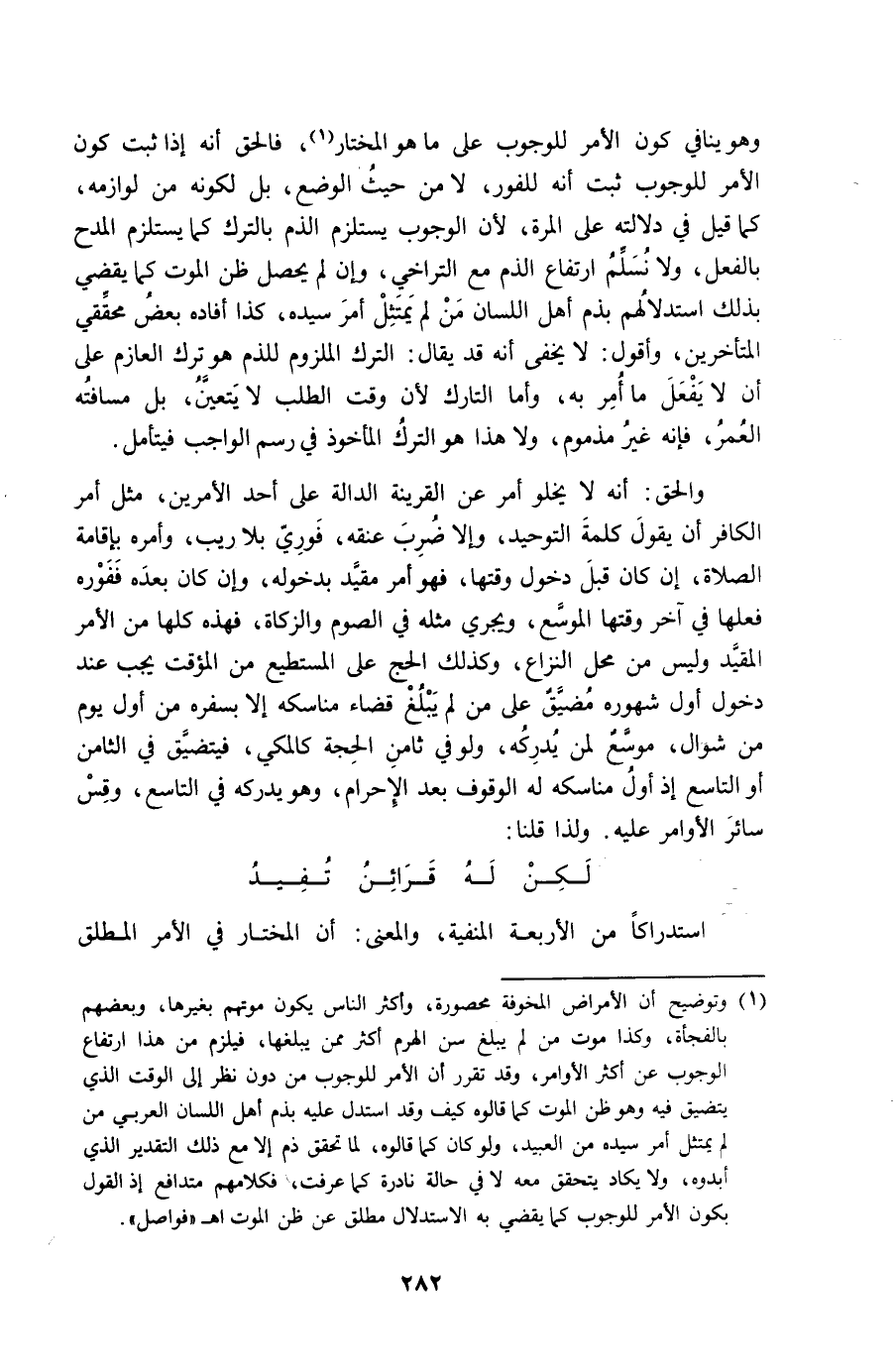 وَهُوَ يُنَافِي كَون الْأَمر للْوُجُوب على مَا هُوَ الْمُخْتَار فَالْحق أَنه إِذا ثَبت كَون الْأَمر للْوُجُوب ثَبت أَنه للفور لَا من حَيْثُ الْوَضع بل لكَونه من لوازمه كَمَا قيل فِي دلَالَته على الْمرة لِأَن الْوُجُوب يسْتَلْزم الذَّم بِالتّرْكِ كَمَا يسْتَلْزم الْمَدْح بِالْفِعْلِ وَلَا نسلم ارْتِفَاع الذَّم مَعَ التَّرَاخِي وَإِن لم يحصل ظن الْمَوْت كَمَا يقْضِي بذلك استدلالهم بذم أهل اللِّسَان من لم يمتثل أَمر سَيّده كَذَا أَفَادَهُ بعض محققي الْمُتَأَخِّرين وَأَقُول لَا يخفى أَنه قد يُقَال التّرْك الْمَلْزُوم للذم هُوَ ترك العازم على أَن لَا يفعل مَا أَمر بِهِ وَأما التارك لِأَن وَقت الطّلب لَا يتَعَيَّن بل مسافته الْعُمر فَإِنَّهُ غير مَذْمُوم وَلَا هَذَا هُوَ التّرْك الْمَأْخُوذ فِي رسم الْوَاجِب فيتأمل