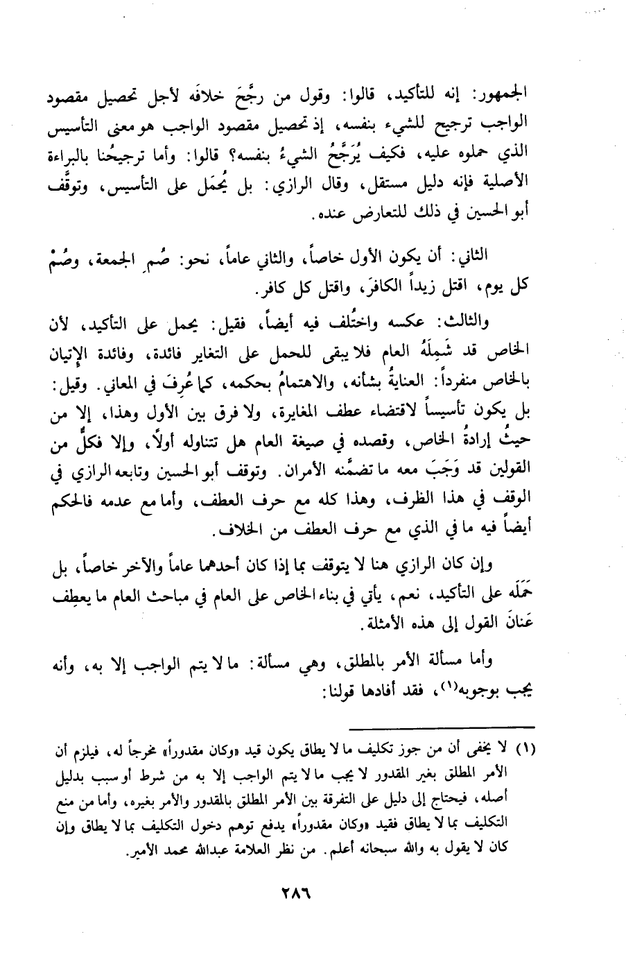 وَإِن كَانَ الرَّازِيّ هُنَا لَا يتَوَقَّف بِمَا إِذا كَانَ احدهما عَاما وَالْآخر خَاصّا بل حمله على التَّأْكِيد نعم يَأْتِي فِي بِنَاء الْخَاص على الْعَام فِي مبَاحث الْعَام مَا يعْطف عنان القَوْل إِلَى هَذِه الْأَمْثِلَة