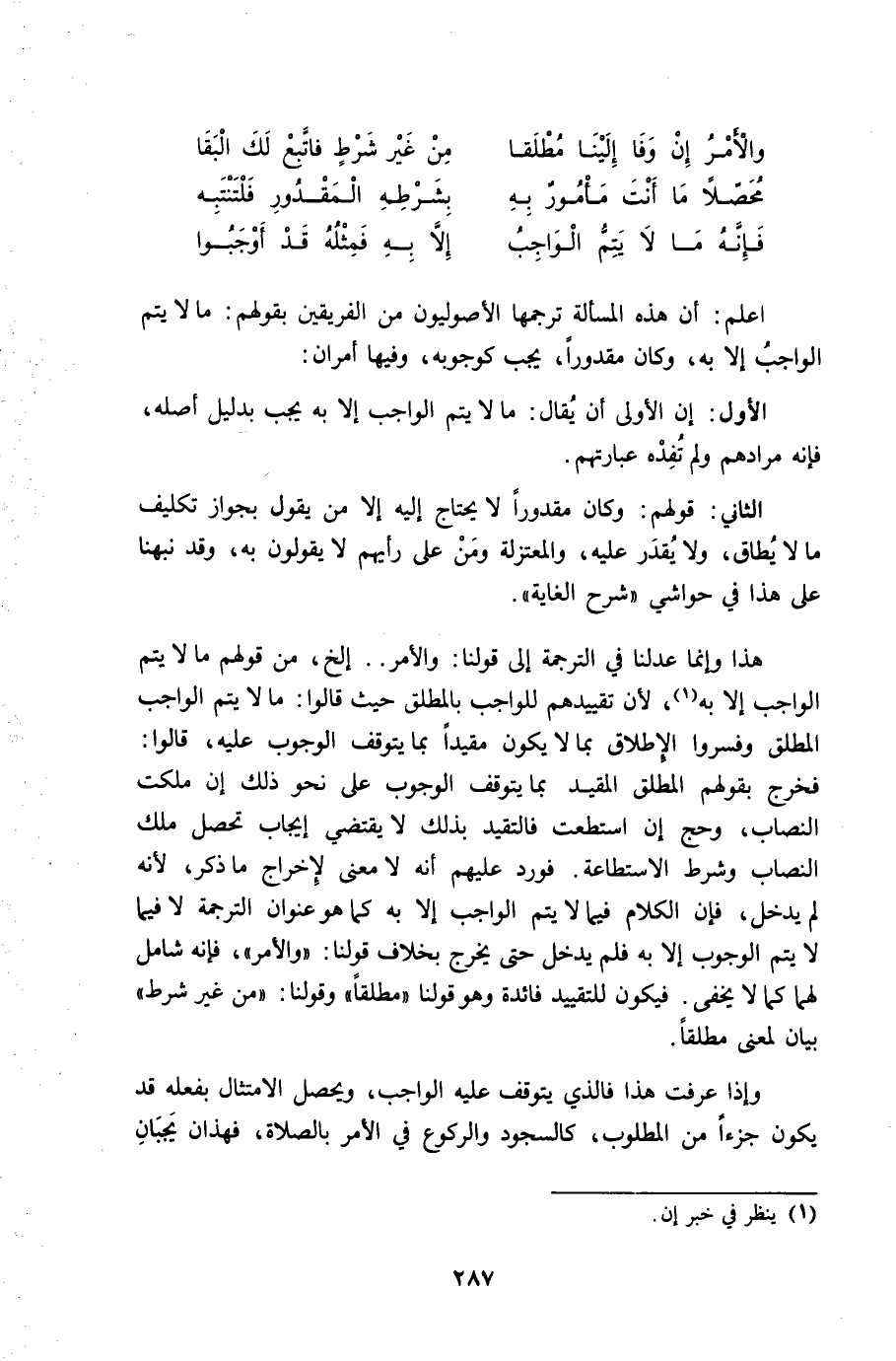 اعْلَم أَن هَذِه الْمَسْأَلَة ترجمها الأصوليون من الْفَرِيقَيْنِ بقَوْلهمْ مَا لَا يتم الْوَاجِب إِلَّا بِهِ وَكَانَ مَقْدُورًا يجب كوجوبه وفيهَا أَمْرَانِ