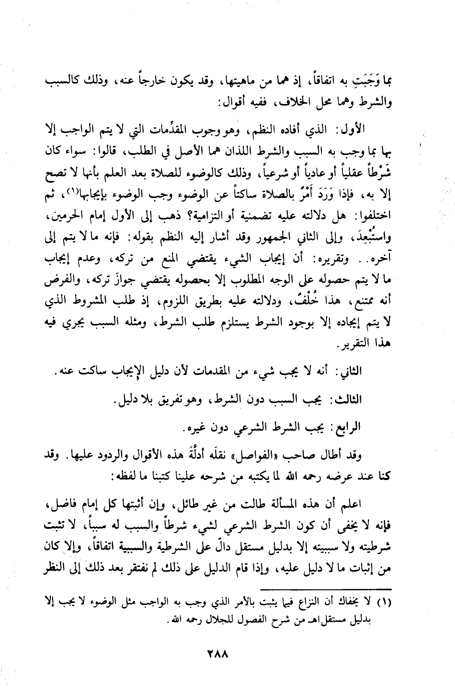 الأول الَّذِي أَفَادَهُ النّظم وَهُوَ وجوب الْمُقدمَات الَّتِي لَا يتم الْوَاجِب إِلَّا بهَا بِمَا وَجب بِهِ السَّبَب وَالشّرط اللَّذَان هما الأَصْل فِي الطّلب قَالُوا سَوَاء كَانَ شرطا عقليا أَو عاديا أَو شَرْعِيًّا وَذَلِكَ كَالْوضُوءِ للصَّلَاة بعد الْعلم بِأَنَّهَا لَا تصح إِلَّا بِهِ فَإِذا ورد أَمر بِالصَّلَاةِ ساكتا عَن الْوضُوء وَجب الْوضُوء بإيجابها ثمَّ اخْتلفُوا هَل دلَالَته عَلَيْهِ تضمنية أَو التزامية ذهب إِلَى الأول إِمَام الْحَرَمَيْنِ واستبعد وَإِلَى الثَّانِي الْجُمْهُور وَقد أَشَارَ إِلَيْهِ النّظم بقوله فَإِنَّهُ مَا لَا يتم إِلَى آخِره وَتَقْرِيره أَن إِيجَاب الشَّيْء يَقْتَضِي الْمَنْع من تَركه وَعدم إِيجَاب مَا لَا يتم حُصُوله على الْوَجْه الْمَطْلُوب إِلَّا بحصوله يَقْتَضِي جَوَاز تَركه وَالْفَرْض أَنه مُمْتَنع هَذَا خلف ودلالته عَلَيْهِ بطرِيق اللُّزُوم إِذْ طلب الْمَشْرُوط الَّذِي لَا يتم إيجاده إِلَّا بِوُجُود الشَّرْط يسْتَلْزم طلب الشَّرْط وَمثله السَّبَب يجْرِي فِيهِ هَذَا التَّقْرِير