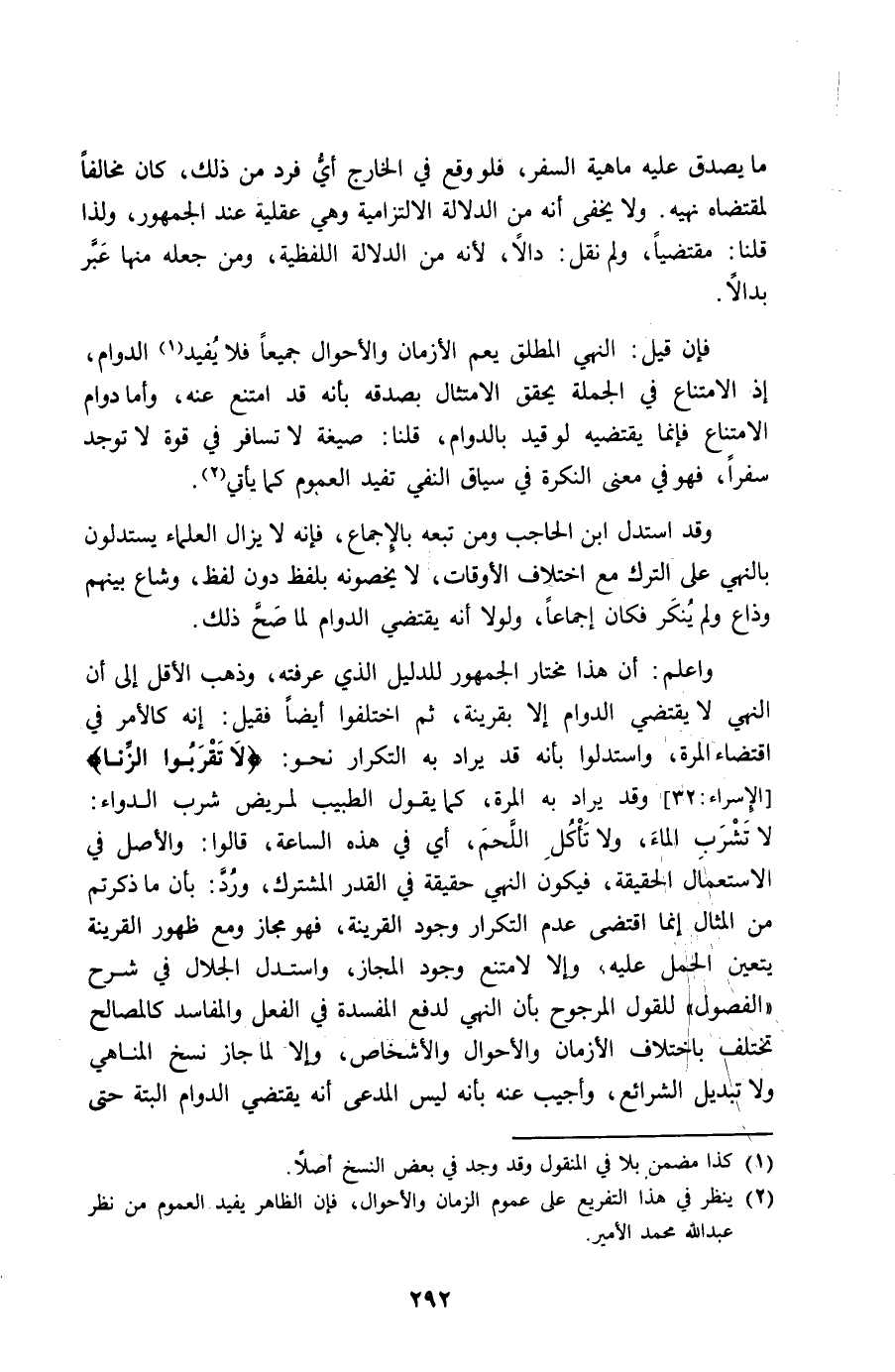 وَاعْلَم أَن هَذَا مُخْتَار الْجُمْهُور للدليل الَّذِي عَرفته وَذهب الْأَقَل إِلَى أَن النَّهْي لَا يَقْتَضِي الدَّوَام إِلَّا بِقَرِينَة ثمَّ اخْتلفُوا أَيْضا فَقيل إِنَّه كالأمر فِي اقْتِضَاء الْمرة وَاسْتَدَلُّوا بِأَنَّهُ قد يُرَاد بِهِ التّكْرَار نَحْو {وَلَا تقربُوا الزِّنَى} وَقد يُرَاد بِهِ الْمرة كَمَا يَقُول الطَّبِيب لمريض شرب الدَّوَاء لَا تشرب المَاء وَلَا تَأْكُل اللَّحْم أَي فِي هَذِه السَّاعَة قَالُوا وَالْأَصْل فِي الِاسْتِعْمَال الْحَقِيقَة فَيكون النَّهْي حَقِيقَة فِي الْقدر الْمُشْتَرك ورد بِأَن مَا ذكرْتُمْ من الْمِثَال إِنَّمَا اقْتضى عدم التّكْرَار وجود الْقَرِينَة فَهُوَ مجَاز وَمَعَ ظُهُور الْقَرِينَة يتَعَيَّن الْحمل عَلَيْهِ وَإِلَّا لامتنع وجود الْمجَاز وَاسْتدلَّ الْجلَال فِي شرح الْفُصُول لِلْقَوْلِ الْمَرْجُوح بِأَن النَّهْي لدفع الْمفْسدَة فِي الْفِعْل والمفاسد كالمصالح تخْتَلف باخْتلَاف الْأَزْمَان وَالْأَحْوَال والأشخاص وَإِلَّا لما جَازَ نسخ المناهي وَلَا تَبْدِيل الشَّرَائِع وَأجِيب عَنهُ بِأَنَّهُ لَيْسَ الْمُدعى أَنه يَقْتَضِي الدَّوَام الْبَتَّةَ حَتَّى