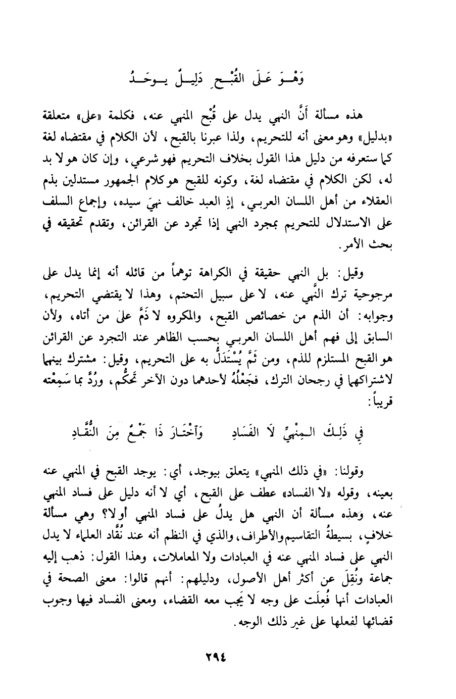 وَقيل بل النَّهْي حَقِيقَة فِي الْكَرَاهَة توهما من قَائِله أَنه إِنَّمَا يدل على مرجوحية ترك النَّهْي عَنهُ لَا على سَبِيل التحتم وَهَذَا لَا يَقْتَضِي التَّحْرِيم وَجَوَابه أَن الذَّم من خَصَائِص الْقبْح وَالْمَكْرُوه لَا ذمّ على من أَتَاهُ وَلِأَن السَّابِق إِلَى فهم اللِّسَان الْعَرَبِيّ بِحَسب الظَّاهِر عِنْد التجرد عَن الْقَرَائِن هُوَ الْقبْح المستلزم للذم وَمن ثمَّ يسْتَدلّ بِهِ على التَّحْرِيم وَقيل مُشْتَرك بَينهمَا لاشْتِرَاكهمَا فِي رُجْحَان التّرْك فَجعله لأَحَدهمَا دون الآخر تحكم ورد بِمَا سمعته قَرِيبا ... فِي ذَلِك الْمنْهِي لَا الْفساد ... وَاخْتَارَ ذَا جمع من النقاد ...