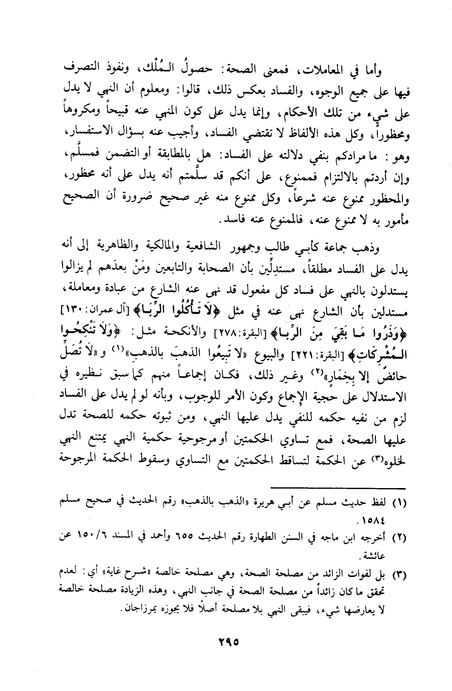 وَذهب جمَاعَة كَأبي طَالب وَجُمْهُور الشَّافِعِيَّة والمالكية والظاهرية إِلَى أَنه يدل على الْفساد مُطلقًا مستدلين بِأَن الصَّحَابَة وَالتَّابِعِينَ وَمن بعدهمْ لم يزَالُوا يستدلون بِالنَّهْي على فَسَاد كل مفعول قد نهى عَنهُ الشَّارِع من عبَادَة ومعاملة مستدلين بِأَن الشَّارِع نهى عَنهُ فِي مثل {لَا تَأْكُلُوا الرِّبَا} {وذروا مَا بَقِي من الرِّبَا} والأنكحة مثل {وَلَا تنْكِحُوا المشركات} والبيوع لَا تَبِيعُوا الذَّهَب بِالذَّهَب وَلَا تصل حَائِض إِلَّا بخمار وَغير ذَلِك فَكَانَ إِجْمَاعًا مِنْهُم كَمَا سبق نَظِيره فِي الِاسْتِدْلَال على حجية الْإِجْمَاع وَكَون الْأَمر للْوُجُوب وَبِأَنَّهُ لَو لم يدل على الْفساد لزم من نَفْيه حكمه للنَّفْي يدل عَلَيْهَا النَّهْي وَمن ثُبُوته حكمه للصِّحَّة تدل عَلَيْهَا الصِّحَّة فَمَعَ تَسَاوِي الحكمتين أَو مرجوحية حكمِيَّة النَّهْي يمْتَنع النَّهْي لخلوه عَن الْحِكْمَة لتساقط الحكمتين مَعَ التَّسَاوِي وَسُقُوط الْحِكْمَة المرجوحة