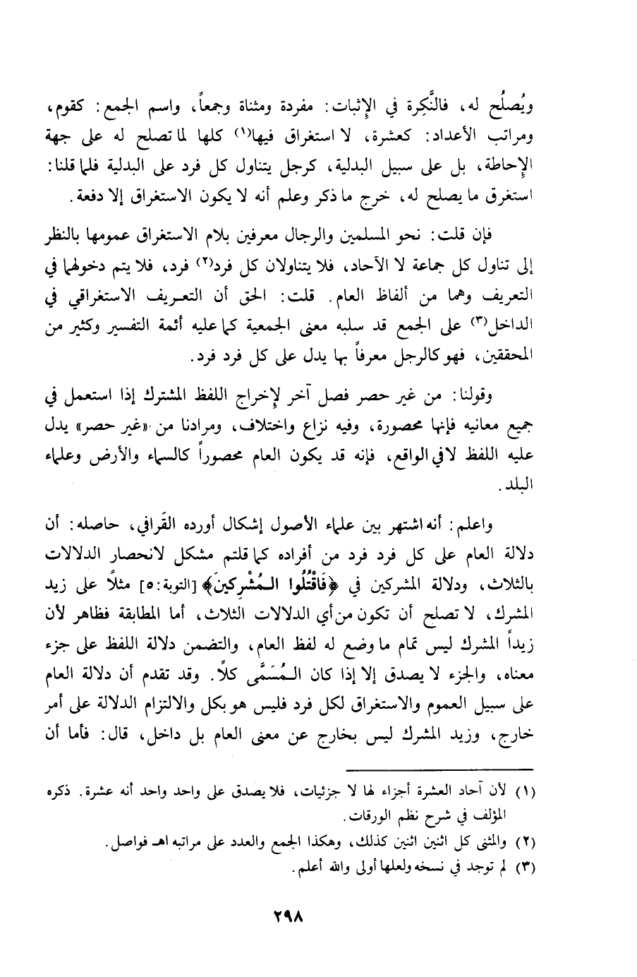 وَاعْلَم أَنه اشْتهر بَين عُلَمَاء الْأُصُول إِشْكَال أوردهُ الْقَرَافِيّ حَاصله أَن دلَالَة الْعَام على كل فَرد فَرد من أَفْرَاده كَمَا قُلْتُمْ مُشكل لانحصار الدلالات بِالثلَاثِ وَدلَالَة الْمُشْركين فِي {فَاقْتُلُوا الْمُشْركين} مثلا على زيد الْمُشرك لَا تصلح أَن تكون من أَي الدلالات الثَّلَاث أما الْمُطَابقَة فَظَاهر لِأَن زيدا الْمُشرك لَيْسَ تَمام مَا وضع لَهُ لفظ الْعَام والتضمن دلَالَة اللَّفْظ على جُزْء مَعْنَاهُ والجزء لَا يصدق إِلَّا إِذا كَانَ الْمُسَمّى كلا وَقد تقدم أَن دلَالَة الْعَام على سَبِيل الْعُمُوم والاستغراق لكل فَرد فَلَيْسَ هُوَ بِكُل والالتزام الدّلَالَة على أَمر خَارج وَزيد الْمُشرك لَيْسَ بِخَارِج عَن معنى الْعَام بل دَاخل قَالَ فَأَما أَن