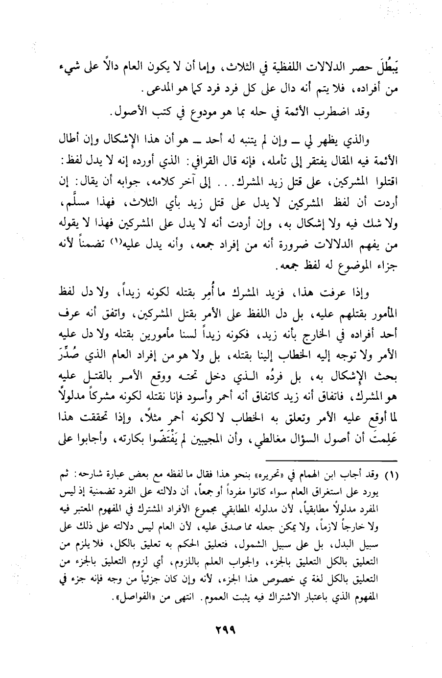 وَالَّذِي يظْهر لي وَإِن لم يتَنَبَّه لَهُ أحد هُوَ أَن هَذَا الْإِشْكَال وَإِن أَطَالَ الْأَئِمَّة فِيهِ الْمقَال يفْتَقر إِلَى تَأمله فَإِنَّهُ قَالَ الْقَرَافِيّ الَّذِي أوردهُ إِنَّه لَا يدل لفظ اقْتُلُوا الْمُشْركين على قتل زيد الْمُشرك إِلَى آخر كَلَامه جَوَابه أَن يُقَال إِن أردْت أَن لفظ الْمُشْركين لَا يدل على قتل زيد بِأَيّ الثَّلَاث فَهَذَا مُسلم وَلَا شكّ فِيهِ وَلَا إِشْكَال بِهِ وَإِن أردْت أَنه لَا يدل على الْمُشْركين فَهَذَا لَا يَقُوله من يفهم الدلالات ضَرُورَة أَنه من إِفْرَاد جمعه وَأَنه يدل عَلَيْهِ تضمنا لِأَنَّهُ جَزَاء الْمَوْضُوع لَهُ لفظ جمعه
