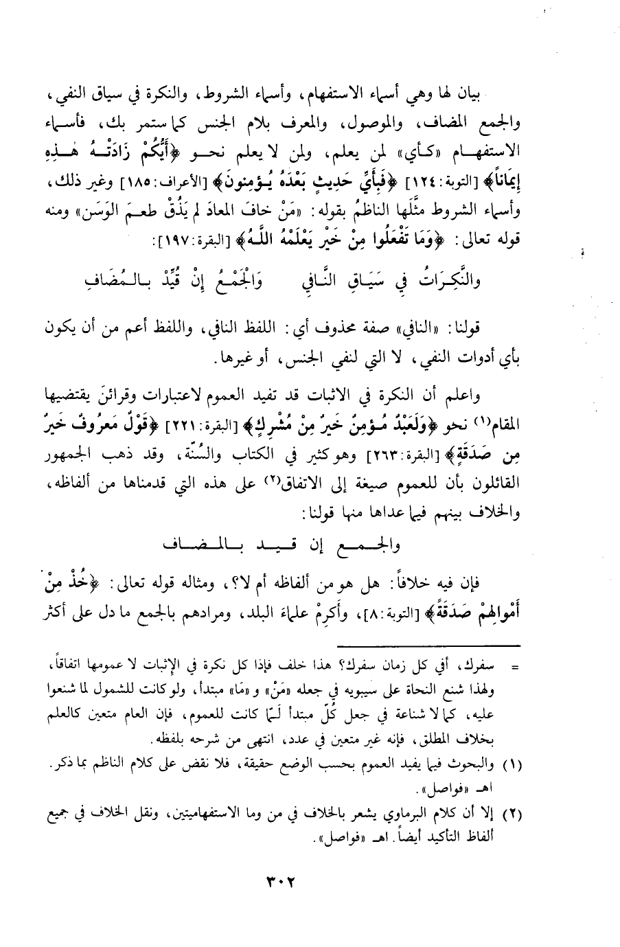 وَاعْلَم أَن النكرَة فِي الاثبات قد تفِيد الْعُمُوم لاعتبارات وقرائن يقتضيها الْمقَام نَحْو {ولعَبْد مُؤمن خير من مُشْرك} {قَول مَعْرُوف ومغفرة خير من صَدَقَة} وَهُوَ كثير فِي الْكتاب وَالسّنة وَقد ذهب الْجُمْهُور الْقَائِلُونَ بِأَن للْعُمُوم صِيغَة إِلَى الِاتِّفَاق على هَذِه الَّتِي قدمناها من أَلْفَاظه وَالْخلاف بَينهم فِيمَا عدهَا مِنْهَا قَوْلنَا ... وَالْجمع إِن قيد بالمضاف ...