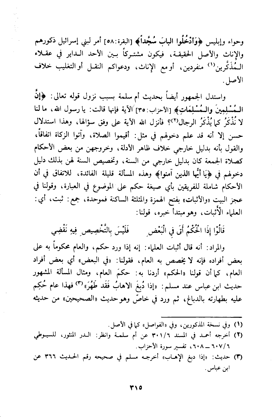 وَاسْتدلَّ الْجُمْهُور أَيْضا بِحَدِيث أم سَلمَة بِسَبَب نزُول قَوْله تَعَالَى {إِن الْمُسلمين وَالْمُسلمَات} الْآيَة فَإِنَّهَا قَالَت يَا رَسُول الله مَا لنا لَا نذْكر كَمَا يذكر الرِّجَال فَأنْزل الله الْآيَة على وفْق سؤالها وَهَذَا اسْتِدْلَال حسن إِلَّا أَنه قد علم دُخُولهمْ فِي مثل أقِيمُوا الصَّلَاة وَآتوا الزَّكَاة اتِّفَاقًا وَالْقَوْل بِأَنَّهُ بِدَلِيل خارجي خلاف ظَاهر الْأَدِلَّة وخروجهن من بعض الْأَحْكَام كَصَلَاة الْجُمُعَة كَانَ بِدَلِيل خارجي من السّنة وَتَخْصِيص السّنة لَهُنَّ بذلك دَلِيل دُخُولهمْ فِي {يَا أَيهَا الَّذين آمنُوا} وَهَذِه الْمَسْأَلَة قَليلَة الْفَائِدَة للاتفاق فِي أَن الأحكم شَامِلَة لِلْفَرِيقَيْنِ بِأَيّ صِيغَة حكم على الْمَوْضُوع فِي الْعبارَة وَقَوْلنَا فِي عجز الْبَيْت والأثبات بِفَتْح الْهمزَة والمثلثة الساكنة فموحدة جمع ثَبت أَي الْعلمَاء الْأَثْبَات وَهُوَ مُبْتَدأ خَبره قَوْلنَا قَالُوا إِذا الحكم أَتَى فِي الْبَعْض ... فَلَيْسَ بالتخصيص فِيهِ نقضي ...