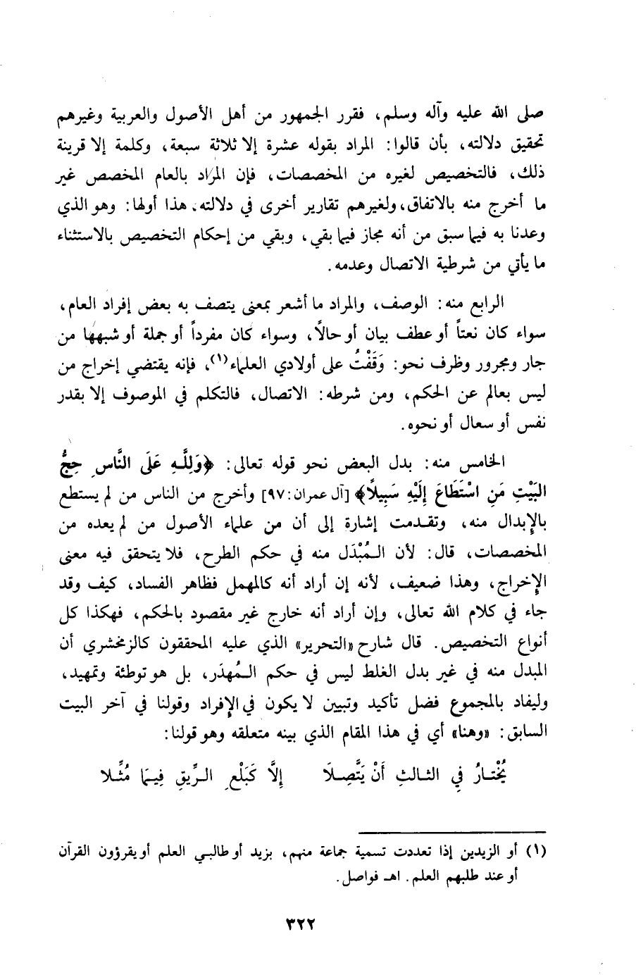 الْخَامِس مِنْهُ بدل الْبَعْض نَحْو قَوْله تَعَالَى {وَللَّه على النَّاس حج الْبَيْت من اسْتَطَاعَ إِلَيْهِ سَبِيلا} وَأخرج من النَّاس من لم يسْتَطع بالإبدال مِنْهُ وَتَقَدَّمت إِشَارَة إِلَى أَن من عُلَمَاء الْأُصُول من لم يعده من المخصصات قَالَ لِأَن الْمُبدل مِنْهُ فِي حكم الطرح فَلَا يتَحَقَّق فِيهِ معنى الْإِخْرَاج وَهَذَا ضَعِيف لِأَنَّهُ إِن أَرَادَ أَنه كالمهمل فَظَاهر الْفساد كَيفَ وَقد جَاءَ فِي كَلَام الله تَعَالَى وَإِن أَرَادَ أَنه خَارج غير مَقْصُود بالحكم فَهَكَذَا كل أَنْوَاع التَّخْصِيص قَالَ شَارِح التَّحْرِير الَّذِي عَلَيْهِ الْمُحَقِّقُونَ كالزمخشري أَن الْمُبدل مِنْهُ فِي غير بدل الْغَلَط لَيْسَ فِي حكم المهدر بل هُوَ تَوْطِئَة وتمهيد وليفاد بالمجموع فضل تَأْكِيد وتبيين لَا يكون فِي الْإِفْرَاد وَقَوْلنَا فِي آخر الْبَيْت السَّابِق وَهنا أَي فِي هَذَا الْمقَام الَّذِي بَينه مُتَعَلقَة وَهُوَ قَوْلنَا ... يخْتَار فِي الثَّالِث أَن يتصلا ... إِلَّا كبلع الرِّيق فِيمَا مثلا ...