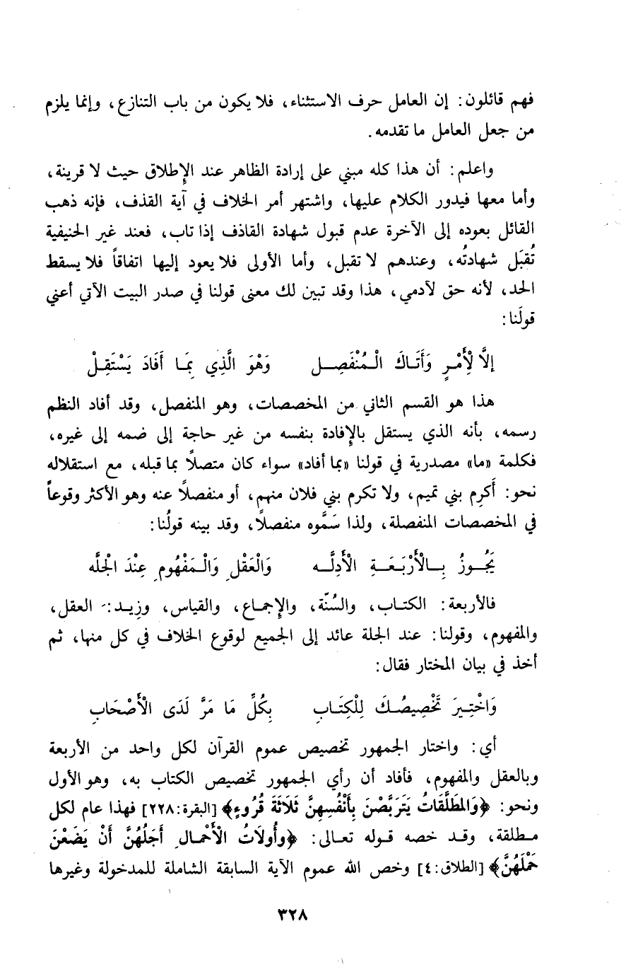 هَذَا هوالقسم الثَّانِي من المخصصات وهوالمنفصل وَقد أَفَادَ النّظم رسمه بِأَنَّهُ الَّذِي يسْتَقلّ بالإفادة بِنَفسِهِ من غير حَاجَة إِلَى ضمه إِلَى غَيره فكلمة مَا مَصْدَرِيَّة فِي قَوْلنَا بِمَا أَفَادَ سَوَاء كَانَ مُتَّصِلا بِمَا قبله مَعَ استقلاله نَحْو أكْرم بني تَمِيم وَلَا تكرم بني فلَان مِنْهُم أَو مُنْفَصِلا عَنهُ وَهُوَ الْأَكْثَر وقوعا فِي المخصصات الْمُنْفَصِلَة وَلذَا سموهُ مُنْفَصِلا وَقد بَينه قَوْلنَا ... يجوز بالأربعة الْأَدِلَّة ... وَالْعقل وَالْمَفْهُوم عِنْد الجلة ...