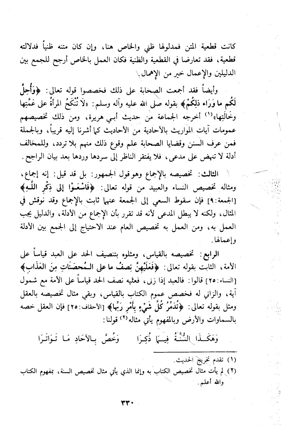 الرَّابِع تَخْصِيصه بِالْقِيَاسِ ومثلوه بتنصيف الْحَد على العَبْد قِيَاسا على الْأمة الثَّابِت بقوله تَعَالَى {فعليهن نصف مَا على الْمُحْصنَات من الْعَذَاب} قَالُوا فَالْعَبْد إِذا زنى فَعَلَيهِ نصف الْحَد قِيَاسا على الْأمة مَعَ شُمُول آيَة وَالزَّانِي لَهُ فخصص عُمُوم الْكتاب بِالْقِيَاسِ وَبَقِي مِثَال تَخْصِيصه بِالْعقلِ وَمثل بقوله تَعَالَى {تدمر كل شَيْء بِأَمْر رَبهَا} فَإِن الْعقل خصّه بالسماوات وَالْأَرْض وبالمفهوم يَأْتِي مِثَاله قَوْلنَا ... وَهَكَذَا السّنة فِيمَا ذكرا ... وَخص بالآحاد مَا تواترا ...