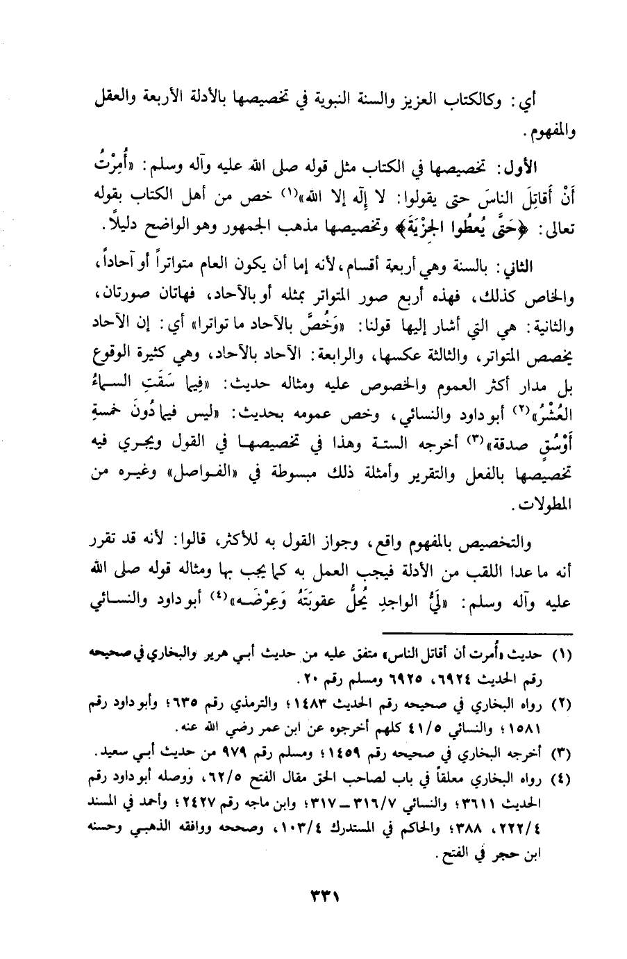 الأول تخصيصها فِي الْكتاب مثل قَوْله صلى الله عَلَيْهِ وَسلم اصدق ان اقاتل النَّاس حَتَّى يَقُولُوا لَا آله الا الله خص من أهل الْكتاب بقول تَعَالَى {حَتَّى يُعْطوا الْجِزْيَة} وتخصيصها مَذْهَب الْجُمْهُور وَهُوَ الْوَاضِح دَلِيلا