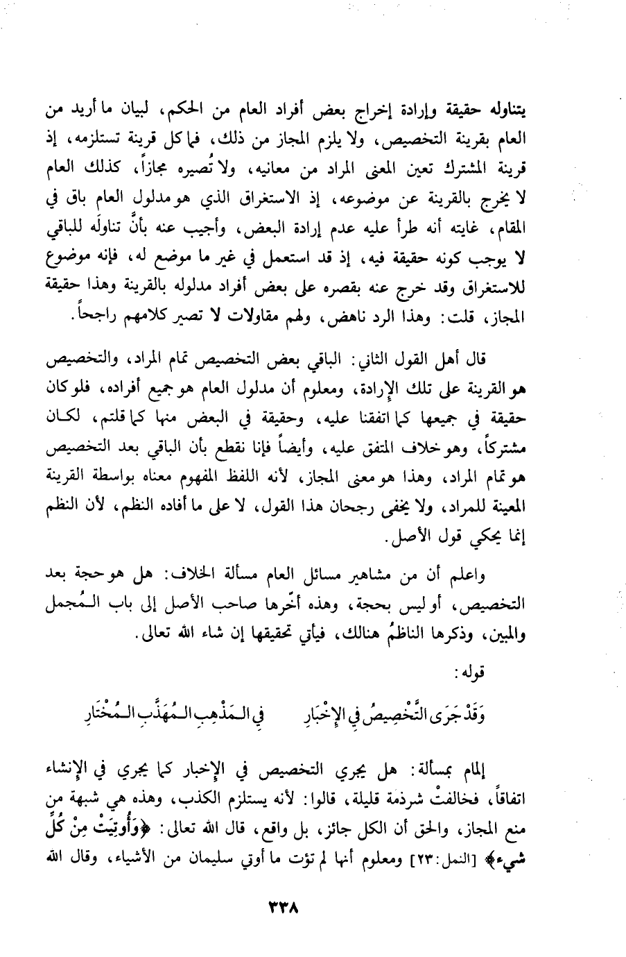 إِلْمَام بِمَسْأَلَة هَل يجْرِي التَّخْصِيص فِي الْإِخْبَار كَمَا يجْرِي فِي الْإِنْشَاء اتِّفَاقًا فخالفت شرذمة قَليلَة قَالُوا لِأَنَّهُ يسْتَلْزم الْكَذِب وَهَذِه هِيَ شُبْهَة من منع الْمجَاز وَالْحق أَن الْكل جَائِز بل وَاقع قَالَ الله تَعَالَى {وَأُوتِيت من كل شَيْء} وَمَعْلُوم أَنَّهَا لم تؤت مَا أُوتِيَ سُلَيْمَان من الْأَشْيَاء وَقَالَ الله