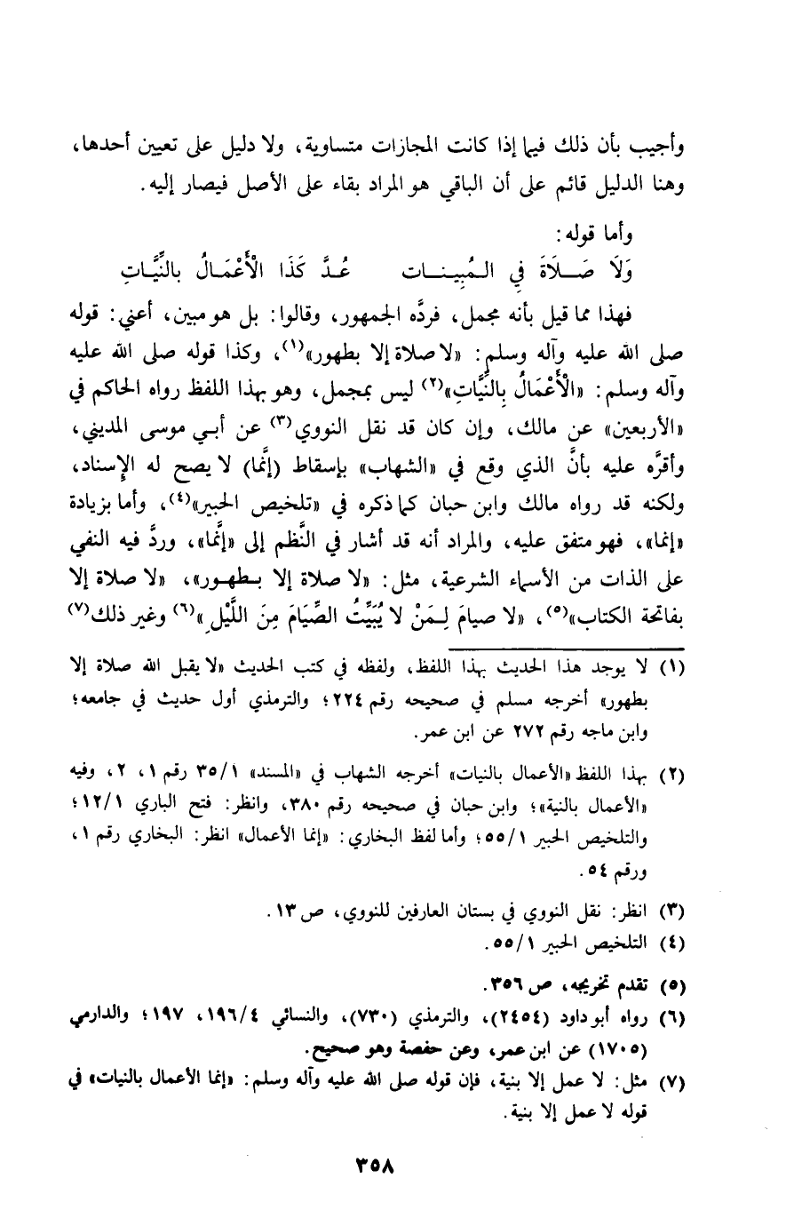 فَهَذَا مِمَّا قيل بِأَنَّهُ مُجمل فَرده الْجُمْهُور وَقَالُوا بل هُوَ مُبين أَعنِي قَوْله صلى الله عَلَيْهِ وَسلم لَا صَلَاة إِلَّا بِطهُور وَكَذَا قَوْله صلى الله عَلَيْهِ وَسلم الْأَعْمَال بِالنِّيَّاتِ لَيْسَ بمجمل وَهُوَ بِهَذَا اللَّفْظ رَوَاهُ الْحَاكِم فِي الْأَرْبَعين عَن مَالك وَإِن كَانَ قد نقل النَّوَوِيّ عَن أبي مُوسَى الْمَدِينِيّ وَأقرهُ عَلَيْهِ بِأَن الَّذِي وَقع فِي الشهَاب بِإِسْقَاط إِنَّمَا لَا يَصح لَهُ الْإِسْنَاد وَلكنه قد رَوَاهُ مَالك وَابْن حبَان كَمَا ذكره فِي تَلْخِيص الحبير وَأما بِزِيَادَة إِنَّمَا فَهُوَ مُتَّفق عَلَيْهِ وَالْمرَاد أَنه قد أَشَارَ فِي النّظم إِلَى إِنَّمَا ورد فِيهِ النَّفْي على الذَّات من الْأَسْمَاء الشَّرْعِيَّة مثل لَا صَلَاة إِلَّا بِطهُور لَا صَلَاة إِلَّا بِفَاتِحَة الْكتاب لَا صِيَام لمن لَا يبيت الصّيام من اللَّيْل وَغير ذَلِك