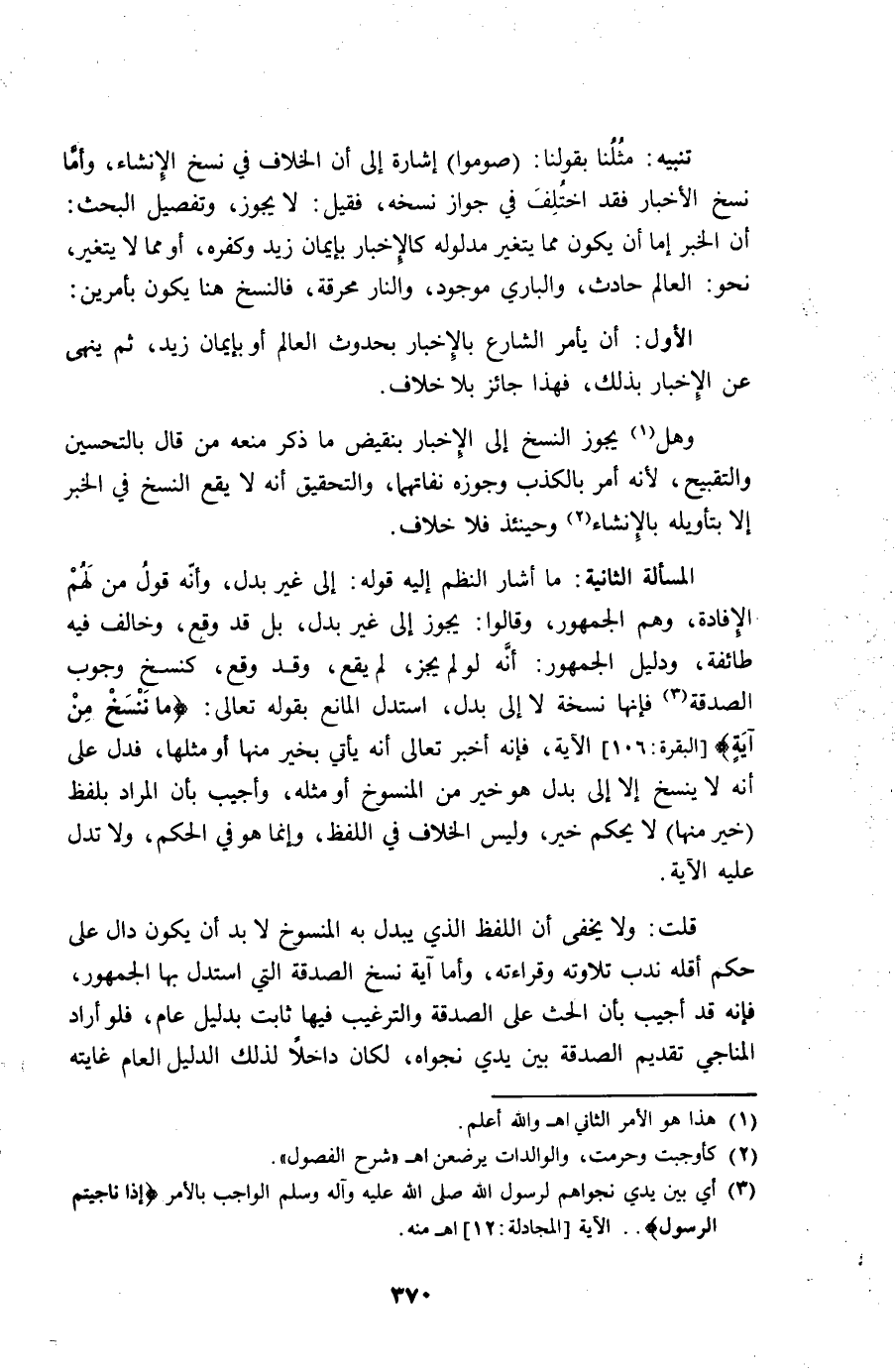 قلت وَلَا يخفى أَن اللَّفْظ الَّذِي يُبدل بِهِ الْمَنْسُوخ لَا بُد أَن يكون دَال على حكم أَقَله ندب تِلَاوَته وقراءته وَأما آيَة نسخ الصَّدَقَة الَّتِي اسْتدلَّ بهَا الْجُمْهُور فَإِنَّهُ قد أُجِيب بِأَن الْحَث على الصَّدَقَة وَالتَّرْغِيب فِيهَا ثَابت بِدَلِيل عَام فَلَو أَرَادَ المناجي تَقْدِيم الصَّدَقَة بَين يَدي نَجوَاهُ لَكَانَ دَاخِلا لذَلِك الدَّلِيل الْعَام غَايَته