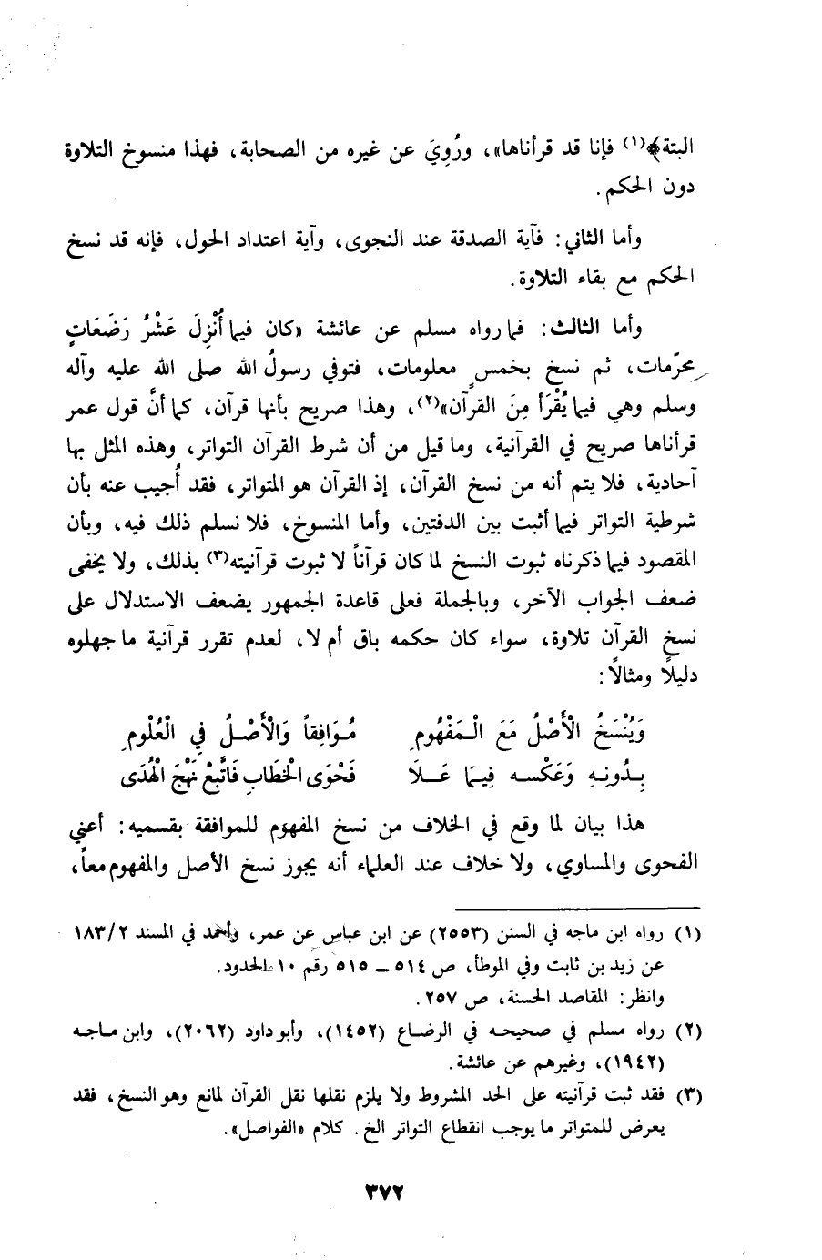 وَأما الثَّالِث فَمَا رَوَاهُ مُسلم عَن عَائِشَة كَانَ فِيمَا أنزل عشر رَضعَات مُحرمَات ثمَّ نسخ بِخمْس مَعْلُومَات فَتوفي رَسُول الله صلى الله عَلَيْهِ وَسلم وَهِي فِيمَا يقْرَأ من الْقُرْآن وَهَذَا صَرِيح بِأَنَّهَا قُرْآن كَمَا أَن قَول عمر قرأناها صَرِيح فِي القرآنية وَمَا قيل من أَن شَرط الْقُرْآن التَّوَاتُر وَهَذِه الْمثل بهَا آحادية فَلَا يتم أَنه من نسخ الْقُرْآن إِذْ الْقُرْآن هُوَ الْمُتَوَاتر فقد أُجِيب عَنهُ بِأَن شَرْطِيَّة التَّوَاتُر فِيمَا أثبت الدفتين وَأما الْمَنْسُوخ فَلَا نسلم ذَلِك بِأَن الْمَقْصُود فِيمَا ذَكرْنَاهُ ثُبُوت النّسخ لما كَانَ قُرْآنًا لَا ثُبُوت قرآنيته بذلك وَلَا يخفى ضعف الْجَواب الآخر وَبِالْجُمْلَةِ فعلى قَاعِدَة الْجُمْهُور يضعف الِاسْتِدْلَال على نسخ الْقُرْآن تِلَاوَة سَوَاء كَانَ حكمه بَاقٍ أم لَا لعدم تقر قرآنية مَا جهلوه دَلِيلا ومثالا
