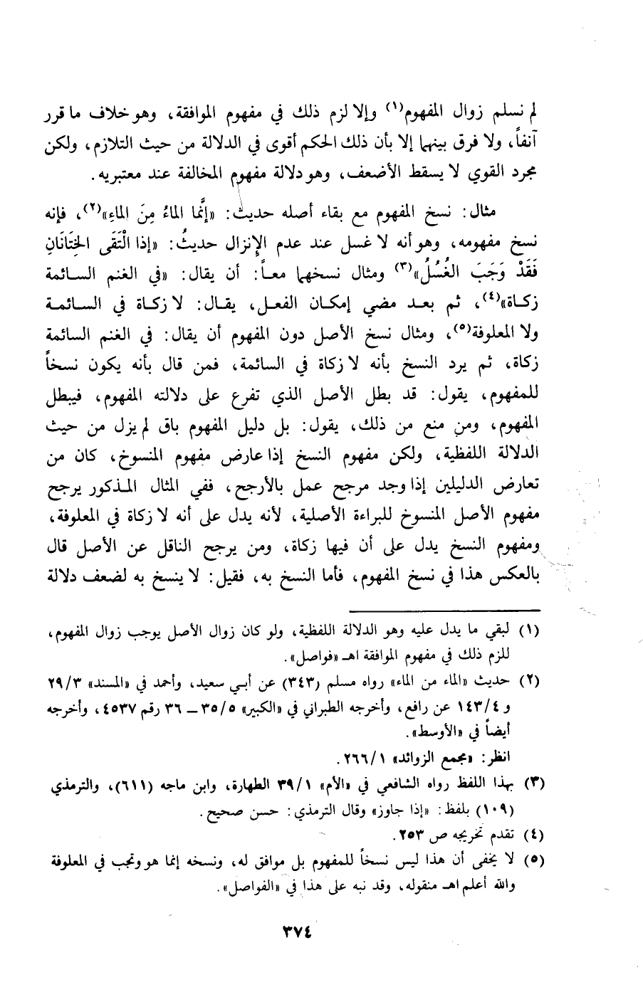 مِثَال نسخ الْمَفْهُوم مَعَ بَقَاء أَصله حَدِيث إِنَّمَا المَاء من المَاء فَإِنَّهُ نسخ مَفْهُومه وَهُوَ أَنه لَا غسل عِنْد عدم الْإِنْزَال حَدِيث إِذا التقى الختانان فقد وَجب الْغسْل وَمِثَال نسخهما مَعًا أَن يُقَال فِي الْغنم السَّائِمَة زَكَاة ثمَّ بعد مُضِيّ إِمْكَان الْفِعْل يُقَال لَا زَكَاة فِي السَّائِمَة وَلَا المعلوفة وَمِثَال نسخ الأَصْل دون الْمَفْهُوم أَن يُقَال فِي الْغنم السَّائِمَة زَكَاة ثمَّ يرد النّسخ بِأَنَّهُ لَا زَكَاة فِي السَّائِمَة فَمن قَالَ بِأَنَّهُ يكون نسخا للمفهوم يَقُول قد بَطل الأَصْل الَّذِي تفرع على دلَالَته الْمَفْهُوم فَيبْطل الْمَفْهُوم وَمن منع من ذَلِك يَقُول بل دَلِيل الْمَفْهُوم بَاقٍ لم يزل من حَيْثُ الدّلَالَة اللفظية وَلَكِن مَفْهُوم النّسخ إِذا عَارض مَفْهُوم الْمَنْسُوخ كَانَ من تعَارض الدَّلِيلَيْنِ إِذا وجد مُرَجّح عمل بالأرجح فَفِي الْمِثَال الْمَذْكُور يرجح مَفْهُوم الأَصْل الْمَنْسُوخ للبراءة الْأَصْلِيَّة لِأَنَّهُ يدل على أَنه لَا زَكَاة فِي المعلوفة وَمَفْهُوم النّسخ يدل على أَن فِيهَا زَكَاة وَمن يرجح النَّاقِل عَن الأَصْل قَالَ بِالْعَكْسِ هَذَا فِي نسخ الْمَفْهُوم فَأَما النّسخ بِهِ فَقيل لَا ينْسَخ بِهِ لضعف دلَالَة