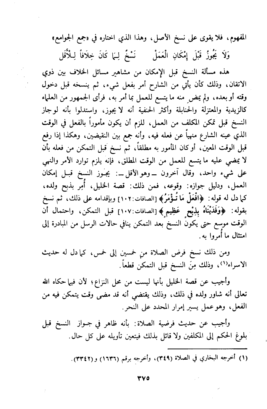 هَذِه مَسْأَلَة النّسخ قبل الْإِمْكَان من مشاهير مسَائِل الْخلاف بَين ذَوي الاتقان وَذَلِكَ كَأَن يَأْتِي من الشَّارِح أَمر بِفعل شَيْء ثمَّ ينسخه قبل دُخُول وقته أَو بعده وَلم يمض مِنْهُ مَا يَتَّسِع للْعَمَل بِمَا أَمر بِهِ فَرَأى الْجُمْهُور من الْعلمَاء كالزيدية والمعتزلة والحنابلة وَأكْثر الْحَنَفِيَّة أَنه لَا يجوز وَاسْتَدَلُّوا بِأَنَّهُ لَو جَازَ النّسخ قبل تمكن الْمُكَلف من الْعَمَل للَزِمَ أَن يكون مَأْمُورا بِالْفِعْلِ فِي الْوَقْت الَّذِي عينه الشَّارِع مَنْهِيّا عَن فعله فِيهِ وَأَنه جمع بَين النقيضين وَهَكَذَا إِذا رفع قبل الْوَقْت الْمعِين أَو كَانَ الْمَأْمُور بِهِ مُطلقًا ثمَّ نسخ قبل التَّمَكُّن من فعله بِأَن لَا يمْضِي عَلَيْهِ مَا يَتَّسِع للْعَمَل من الْوَقْت الْمُطلق فَإِنَّهُ يلْزم توارد الْأَمر وَالنَّهْي على شَيْء وَاحِد وَقَالَ آخَرُونَ وَهُوَ الْأَقَل يجوز النّسخ قبل إِمْكَان الْعَمَل وَدَلِيل جَوَازه وُقُوعه فَمن ذَلِك قصَّة الْخَلِيل أَمر بِذبح وَلَده كَمَا دلّ لَهُ قَوْله {افْعَل مَا تُؤمر} وبإقدامه على ذَلِك ثمَّ نسخ بقوله {وفديناه بِذبح عَظِيم} قبل التَّمَكُّن وَاحْتِمَال أَن الْوَقْت موسع حَتَّى يكون النّسخ بعد التَّمَكُّن يُنَافِي حالات الرُّسُل من الْمُبَادرَة إِلَى امْتِثَال مَا أمروا بِهِ