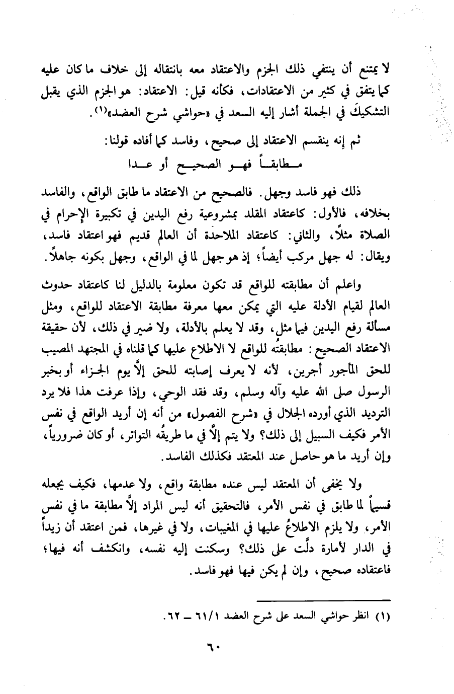 ثمَّ إِنَّه يَنْقَسِم الِاعْتِقَاد إِلَى صَحِيح وفاسد كَمَا أَفَادَهُ قَوْلنَا ... مطابقا فَهُوَ الصَّحِيح أَو عدا ...